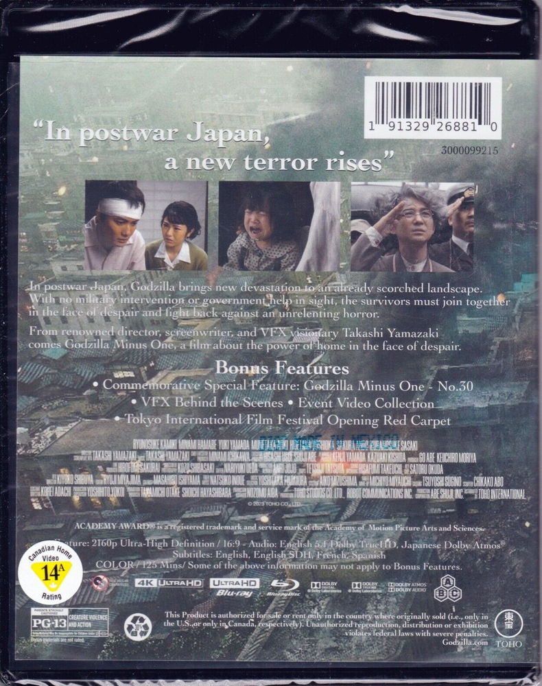 GODZILLA MINUS ONE 4K ULTRA HD & BLU-RAY SET Japan has barely recovered from the Second World War when a gigantic peril emerges off the coast of Tokyo. Koichi, a deserter traumatised by his first confrontation with Godzilla, sees this as an opportunity to redeem his conduct during the war. Starring Minami Hamabe, Ryunosuke Kamiki, Yuki Yamada, Hidetaka Yoshioka and Michael Arias. Written and directed by Takashi Yamazaki. Theatrical Version: 125 minutes Languages: English, French, Japanese and Spanish 4K Ultra HD Region: Region Free Bluray Region: Region Free Slipcover: Not Included We combine shipping for multiple auction winnings won within 7 days. We have set shipping and handling prices. If you do not agree with them, do not bid.