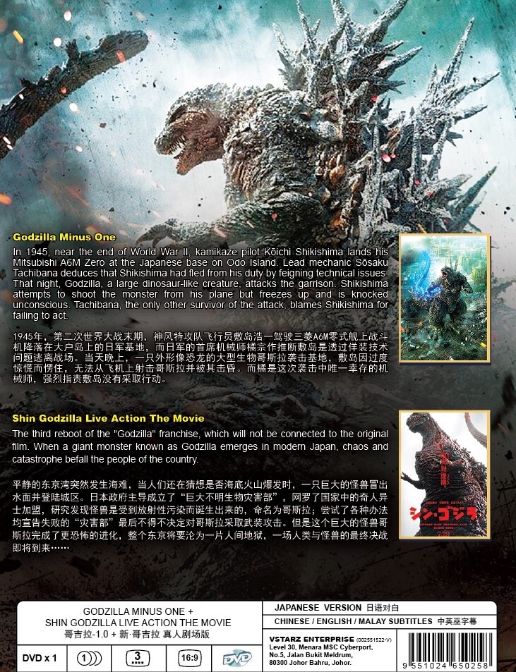 Synopsis Godzilla Minus One Post-war Japan is at its lowest point when a new crisis emerges in the form of a giant monster baptized in the horrific power of the atomic bomb. Shin Godzilla All of the sudden, a giant creature immediately appears, destroying town after town plunged into chaos with its landing reaching the capital. This mysterious giant monster is named ""Godzilla"". DVD Details Disc Quantity : 1 Discs Episodes : Movie Version@Language : Japanese Subtitles : English / Chinese / Malay Format & Region : DVD9 / NTSC & All region code ( 16: 9 ) Duration : Approx. 240 Minutes Genres : Action, Tokusatsu, Horror, Sci-Fi Shipping & Handling Details Shipment open to Worldwide. Free shipment to all COUNTRY!! The product is well packed using bubble padded envelope/boxes to protect product from damages The product will be shipped using Express Mail with Traceable Postage . Tracking code will be provided to customers. Shipment notification will be given to the customer once the product is ready to ship. For Worldwide International Shipment , please allow 5 - 14 days for your item to arrive. Replacement Policy We are 100% committed to ensuring our customers are satisfied with their purchase. Any product found to be faulty, We will issue new replacement discs. Products are FULLY INSURED (Any product lost in shipment will be replace with a new set or fully refund) Contact us for more information. Customer’s Notes Please contact us before leaving any bad FEEDBACKS or DISPUTES. We provide after sales service