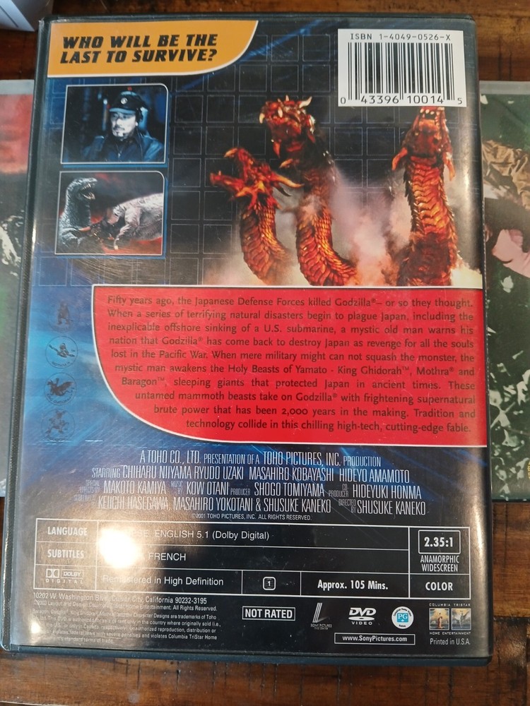 This is a DVD of the movie "Godzilla, Mothra & King Ghidorah: Giant Monsters All-Out Attack," featuring creatures and monsters in a sci-fi and fantasy genre. The DVD is in English with English subtitles, and is a cult classic from Sony Pictures.