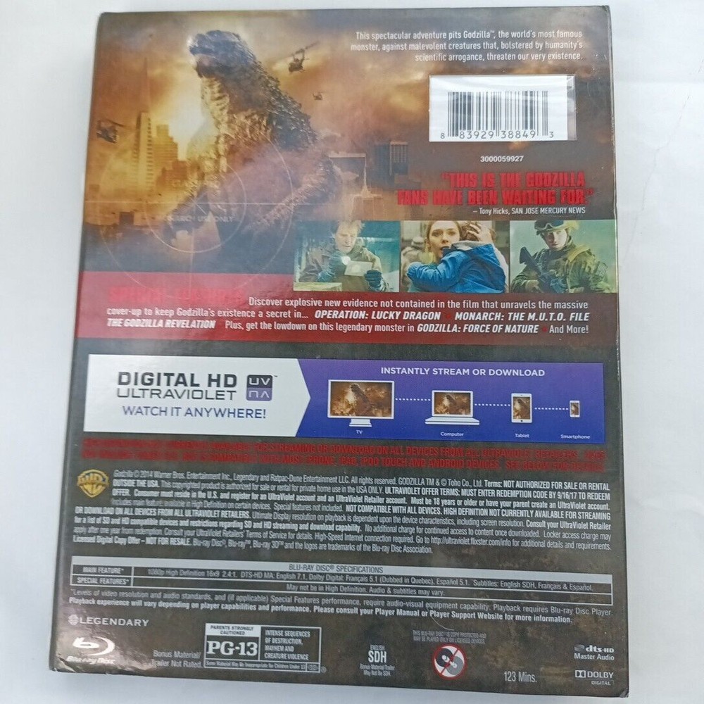 Experience the epic adventure of the legendary Godzilla in stunning high-definition with this Blu-ray edition. This 2014 release features a PG-13 rating and is a must-have for fans of science fiction and horror movies. The disc comes with a special slipcover and is still sealed, ensuring that you get the ultimate viewing experience without any scratches or damage. This Warner Home Video production is perfect for collectors and movie enthusiasts alike, with its impressive format and gripping storyline. Get ready to witness the destruction and chaos that Godzilla brings, as he battles through the city streets and towering buildings. Add this Blu-ray edition to your collection today and enjoy the ultimate viewing experience of this iconic movie. See photos for conditions If you have any questions or concerns, please ask before buying I will combine multiple orders and refund the shipping difference back to you. Listing and template services provided by inkFrog
