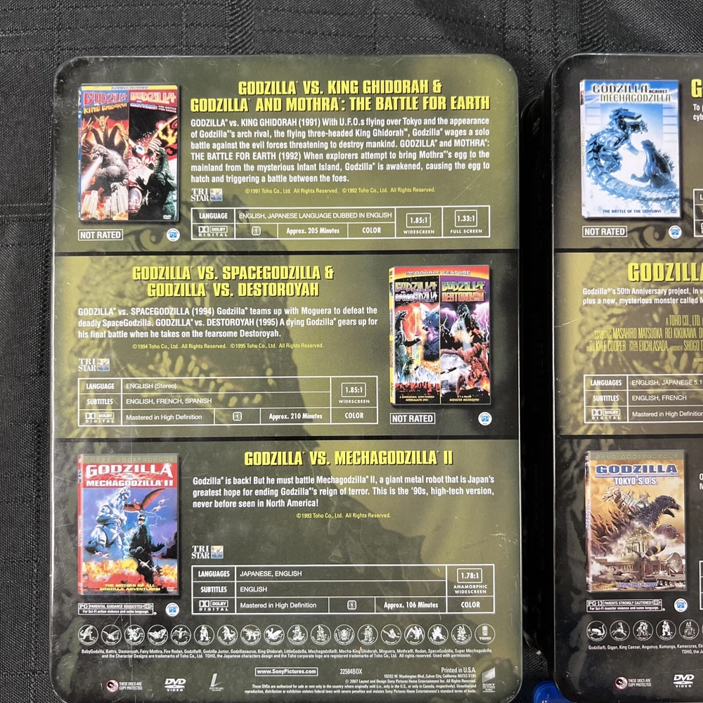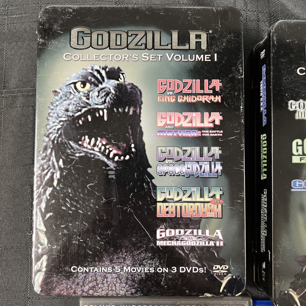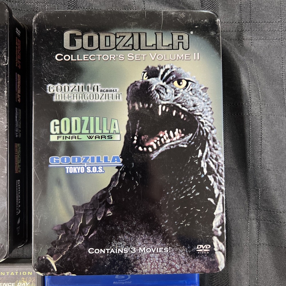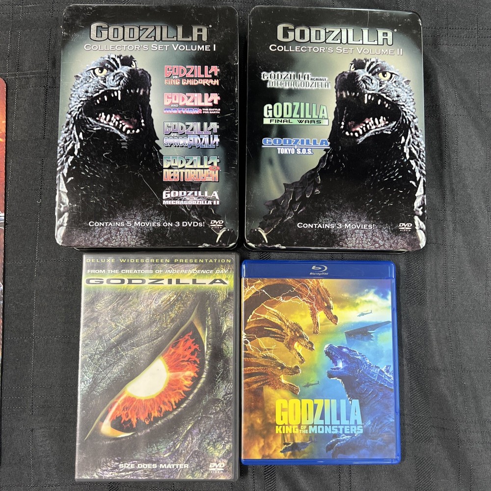 You are purchasing a really nice GODZILLA DVD Collection. You get 9 DVD Discs (9 Total Movies) with over 1100 total run time minutes! The boxes that house the collection are in ok condition (some yellowing & surface wear) with the steel boxes in better shape! All the Discs themselves are in excellent condition. You get the following movies: Disc I - 1998 GODZILLA 139 MINUTES Disc II & III - 2019 GODZILLA KING OF MONSTERS - BLUE RAY & DVD - 278 MINUTES Disc IV -VIII - GODZILLA COLLECTORS BOX SET V. 1 ( 5 MOVIES) -GODZILLA VS. KING GHIDORA -GODZILLA VS MOTHRA -GODZILLA VS SPACE GODZILLA -GODZILLA VS DESTOROYAH -GODZILLA VS MECHAGODZILLA II Disc IX - XI - GODZILLA COLLECTORS BOX SET V.2. (3 MOVIES) - GODZILLA TOKYO SOS - GODZILLA VS MECHAGODZILLA - GODZILLA 2000 “GET READY TO CRUMBLE” (THIS MOVIE REPLACES A DAMAGED GODZILLA FINAL WARS) This listing Ships USPS Ground Advantage! FREE SHIPPING!!