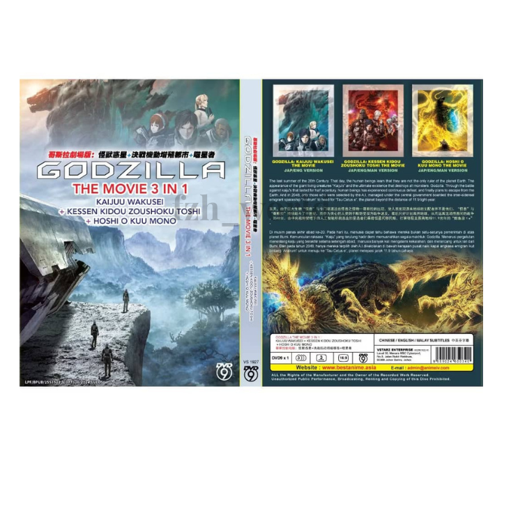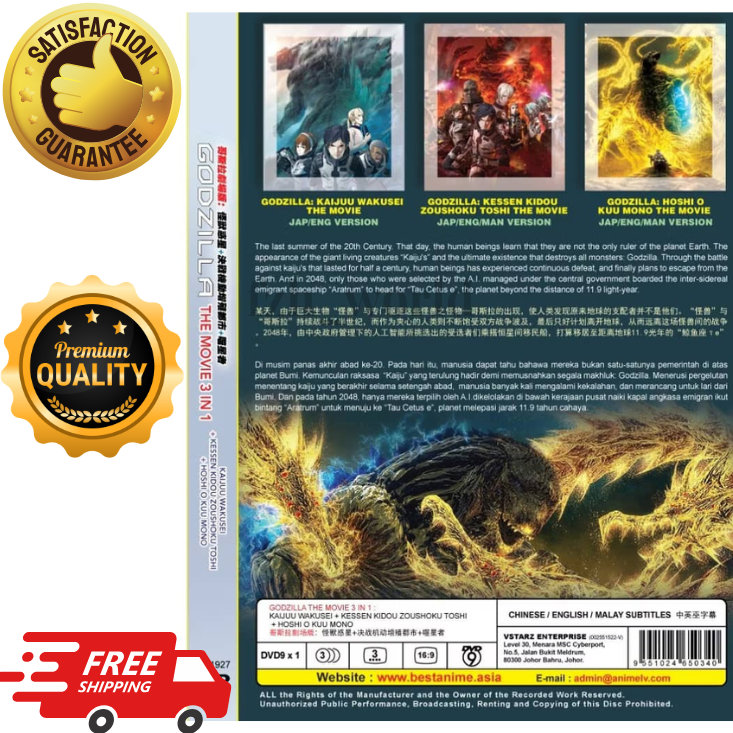 GODZILLA THE MOVIE 3 IN 1 - ANIME MOVIE DVD BOX SET (ENG DUB) FREE SHIPPING Dive into the thrilling world of monster mayhem with the "Godzilla The Movie 3 In 1" Anime DVD Box Set. This set collects all the action and adventure from the engaging anime film series, where the iconic monster reigns chaos. Directed by Hiroyuki Seshita, the series delivers an enthralling blend of intense battles and captivating storytelling. Enjoy the complete series in English dub with the added option of original Japanese audio, catering to a diverse audience. Free shipping is included, making it an effortless addition to your anime collection. With a DVD region code of 0, it's playable worldwide. Fans of the genre and newcomers alike will find this box set an essential part of their entertainment library. Description Synopsis GODZILLA THE MOVIE The last summer of the 20th Century. That day, the human beings learn that they are not the only ruler of the planet Earth. The appearance of the giant living creatures “Kaiju's” and the ultimate existence that destroys all monsters: Godzilla. Through the battle against kaiju's that lasted for half a century, human beings has experienced continuous defeat, and finally plans to escape from the Earth. And in 2048, only those who were selected by the A.I. managed under the central government boarded the inter-sidereal emigrant spaceship “Aratrum” to head for “Tau Cetus e”, the planet beyond the distance of 11.9 light-year. However, the environmental condition differences between that of the Earth and Tau e, which they finally arrived after 20 years were far beyond the predicted numbers, and was not an environment considered to be habitable by human beings. The young man on the emigrant ship: Haruo, who saw his parents killed by Godzilla in front of his eyes when he was 4 years old, had only one thing in his mind for 20 years: to return to the Earth and defeat Godzilla. Shut out from the possibility of emigration, as the living environment in the ship deteriorates, the group of “Earth Returnists” led by Haruo became the majority, and determines to head back to Earth through a dangerous long-distance hyperspace navigation. However, the Earth they have returned has already passed the time of 20,000 years, and has become an unknown world with the ecosystem reigned by Godzilla. At the end, will human beings win back the Earth? And what will Haruo see beyond his fate? Contents: 1) Kaijuu Wakuusei The Movie 2) Kessen Kidou Zoushoku Toshi The Movie 3) Hoshi O Kuu Mono The Movie We Only Sell Original/Genuine DVDs. All DVDs I'm selling are from Licensed Publisher in Malaysia. All DVDs come with Original Sealed Authenticated Sticker / Hologram by Malaysia Censorship Board. Satisfaction Guaranteed If doesn't satisfied with your purchase, contact us immediately and we can work out something to solve it. ~ FREE Shipping Worldwide by Registered AirMail with Tracking Numbers Provided ~ Packaging Detail The product is well packed using bubble padded envelope/boxes to protect product from damages (bubble wraps) Shipping Policy Free Economy International Shipping (to USA) with a tracking number. All items will be shipped within 3 working days after receiving payment. If you do not receive the item in stated period of time, please do not hesistate to contact me. We will reply within 24hrs and will try to solve the problem for you. Custom Duties & Tax Policy Please note that the custom duties and tax are not included in the product price and shipping price. All custom duties and tax , if any, (by your country's customs) will be borne by the buyer and payable at the destination . We do not responsible for any custom fees, import duties or taxes in buyer country. Returns Policy Your satisfaction is our top priority. Items can be returned to exchange within 30 days. Before we ship the item, we will do a final check to make sure the item is in undamaged condition. If the item is missing in the transit, we will refund 100% to the buyer If the item arrived damaged / faulty or the wrong item is sent, please contact us with photo proof. We will arrange either a refund or a replacement for you at our expense. If you wish to return your item for any other reason apart from damaged on delivery or wrong item sent, please send the item back to us with the original unused and unopened packaging. The buyer will be responsible for the return shipping charges. Once the item reach us and inspected, we will arrange a refund to you. Please note that all opened items cannot be returned nor refunded. Buyer return incorrect item to us must use "Registered Mail" with tracking number so both parties can trace the parcel status. Contact Information If you require any help with your order, please don?t hesitate to contact us by the ebay message system. We will reply you within 24 hours. We've put our effort to make the listings incredibly detailed so that buyer can be well informed in making buying decisions. However if for some reasons you feel disappointed, please contact us first prior to leave negative feedback or open case/dispute so that we may work with you to make it right. We always strive to offer you a good service. Any questions please feel free to contact us. Please Check out my other Items for sale! Thanks for looking! Thank you for shopping with us!