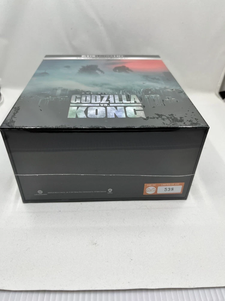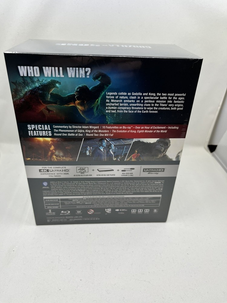 GODZILLA VS KONG [4K UHD + 2D] Blu-ray Steelbook One Click Box Set [MANTA LAB]. Securely packaged in custom cut styrofoam. #538 of 600 WEA, Exclusive Steelcase designed by Manta Lab features "Full Glossy" Finish and "Embossed Title". One Click: Spot Foil, Spot Matte, Spot Glossy, Embossing Premiums: Booklet, Postcards, Character Cards, Envelope, Exclusive Numbering Sticker, Exclusive Release Front Sticker, Exclusive Release Lenticular Sticker, Tip On. No. of Disc: 2 (Region: A,B,C) Audio Specifications: UHD Dolby Atmos-TrueHD: English & Italian, Dolby Digital: English Descriptive Audio 5.1, English 5.1, French 5.1, Italian 5.1 & Spanish 5.1. BD Dolby Atmos-TrueHD: English, Dolby Digital: English Descriptive Audio 5.1, English 5.1, Czech 5.1, Hindi 5.1, Hungarian 5.1, Italian 5.1, Polish 5.1, Spanish 5.1, Tamil 5.1 & Telugu 5.1. Subtitles: UHD Cantonese, Complex Chinese, English SDH, Canadian & Parisian French, Danish, Finnish, Italian SDH, Korean, Norwegian, Spanish & Swedish. BD Cantonese, Complex Chinese, English SDH, Bulgarian, Czech, Danish, Finnish, Greek, Hindi, Hungarian, Italian SDH, Korean, Norwegian, Polish, Romanian, Spanish, Swedish, Tamil & Telugu. Special Feature: Commentary by Director Adam Wingard / 10 Featurettes on Blu-ray – Over an Hour of Excitement – Including: The Phenomenon of Gōjira, King of the Monsters / The Evolution of Kong, Eighth Wonder of the World Round One: Battle at Sea / Round Two: One Will Fall