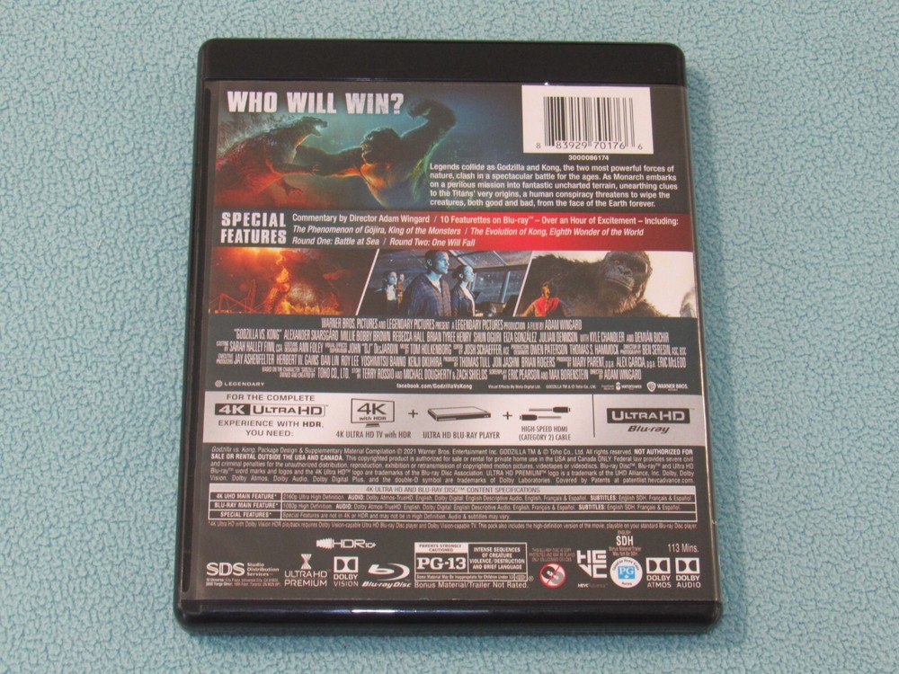 ~ GODZILLA VS. KONG (4K Ultra HD/Blu-Ray, 2-Disc Set) ~ You are bidding on the exact item pictured: Original 4K & blu-ray discs, case, cover art. This item is used, but in VERY GOOD Condition: Discs have NO scratches or damage & play perfectly! Case & artwork are in good shape. Authentic Region 1 (Blu-Ray Region A: U.S.) Warner Bros Widescreen release. Please feel free to contact me if you have any questions or concerns. Thanks for looking!! :)