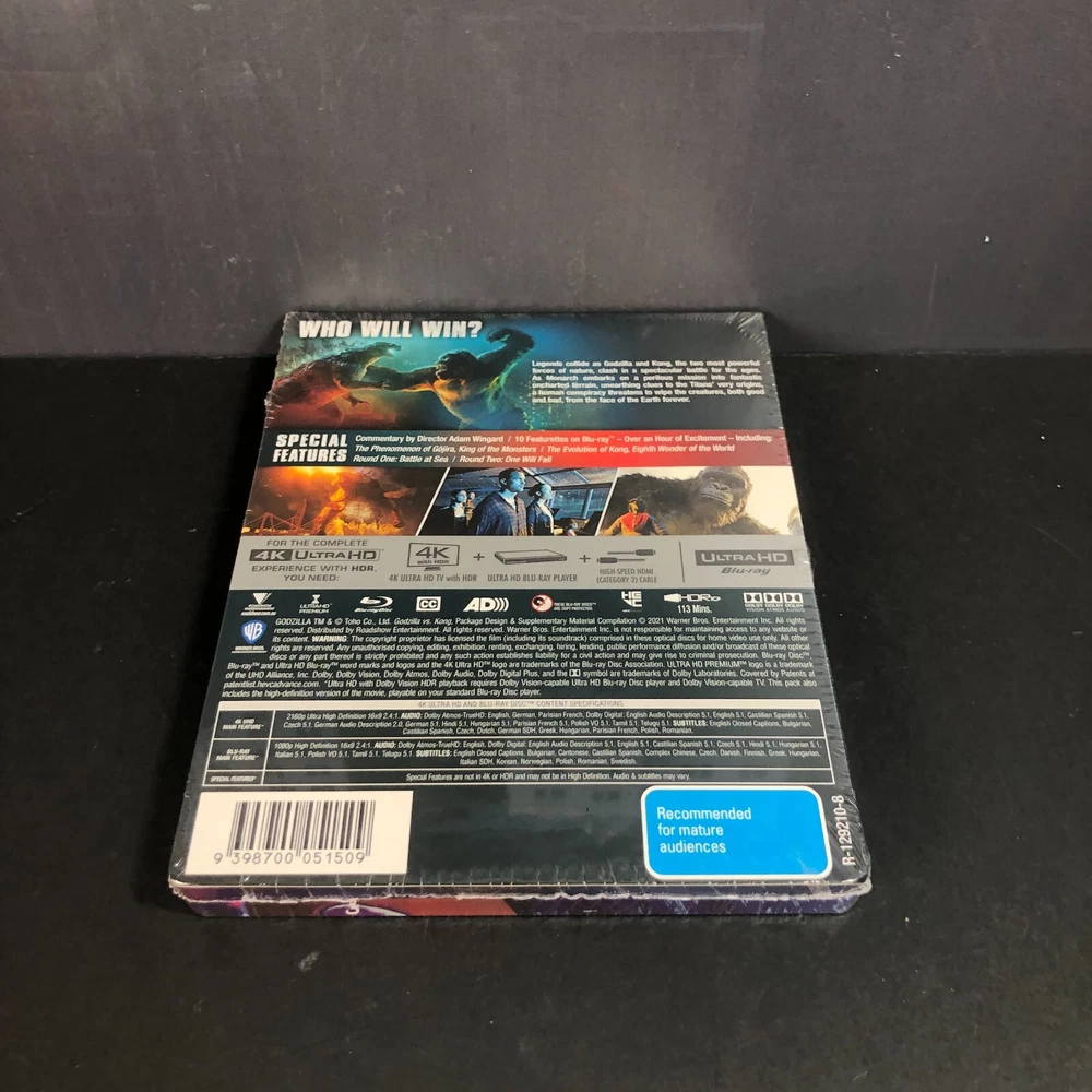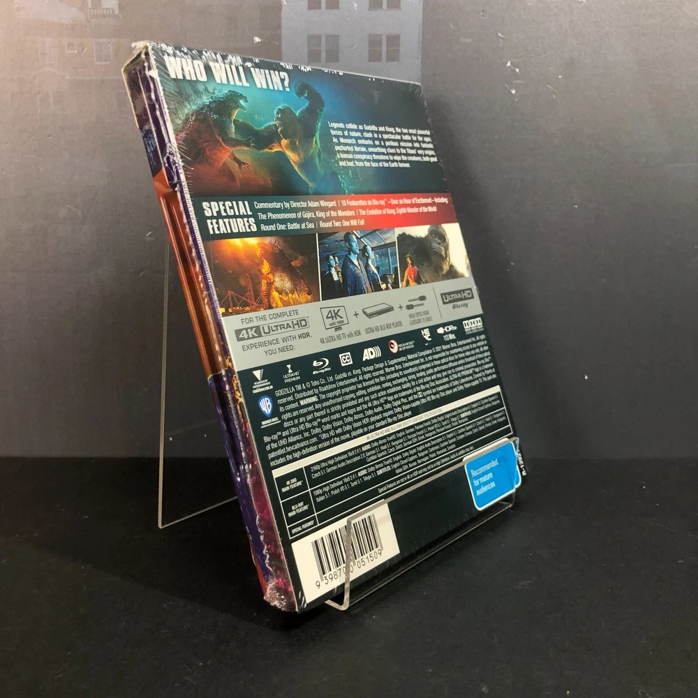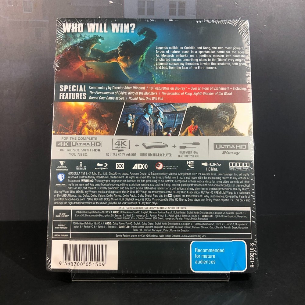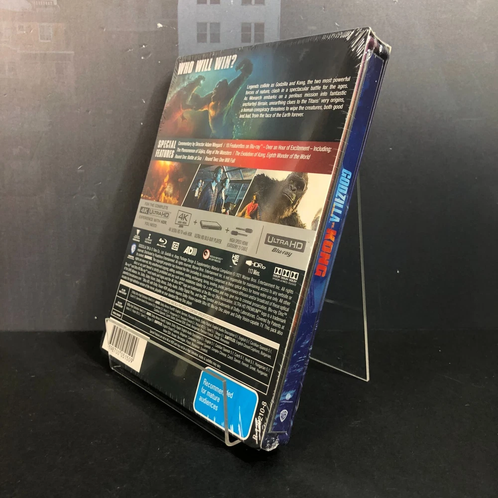 Presenting the GODZILLA VS. KONG (JB Hi-Fi EXCLUSIVE) STEELBOOK 4K ULTRA HD + BLU-RAY, a limited edition release for fans of the epic 2021 monster showdown. Produced by Legendary Pictures and distributed by Warner Bros. Pictures, this exclusive SteelBook edition, brought to Blu-ray by Roadshow Entertainment, delivers a thrilling cinematic experience of the ultimate clash between two iconic kaiju. Released on June 23, 2021, this edition features both 4K Ultra HD and Blu-ray formats, offering a superior viewing experience of the action-packed film (114 minutes, Rated M). The SteelBook packaging is visually striking, with a high-gloss finish and sleek design that leave a lasting impression. The front cover features an intense battle between King Kong and Godzilla, while the back showcases both monsters in a powerful "ROAR!" moment. Inside, the artwork captures a dramatic scene from the film's epic showdown. with the two discs elegantly housed on one side. The combination of breathtaking visuals and powerful storytelling makes this limited edition a true collector’s gem, perfect for fans of both monsters and high-quality film presentations. Godzilla vs. Kong (2021) is a monster film directed by Adam Wingard, produced by Legendary Pictures, and distributed by Warner Bros. It is the fourth film in the Monsterverse and a sequel to Kong: Skull Island (2017) and Godzilla: King of the Monsters (2019). The film stars Alexander Skarsgård, Millie Bobby Brown, Rebecca Hall, and Brian Tyree Henry, with Brown and Chandler reprising their roles. The plot follows Kong's clash with Godzilla after humans relocate him to Hollow Earth to retrieve a power source for a secret weapon designed to stop Godzilla's mysterious attacks. The film grossed $470 million worldwide and became a major streaming success on HBO Max. It was released on March 24, 2021, after delays due to the pandemic. A sequel, Godzilla x Kong: The New Empire, was released on March 29, 2024. Director: Adam Wingard Writers: Eric Pearson, Max Borenstein, Terry Rossio, Michael Dougherty, Zach Shields Starring: Alexander Skarsgård, Millie Bobby Brown, Rebecca Hall, Brian Tyree Henry, Shun Oguri, Eiza González Producer: Thomas Tull SPECIAL FEATURES Audio Commentary The God Godzilla Attacks The Phenomenon of Gojira, King of the Monsters The King Kong Leaves Home Kong Discovers Hollow Earth Behold Kong's Temple The Evolution of Kong, Eighth Wonder of the World The Rise of Mecha-Godzilla The Battles Round One: Battle at Sea Round Two: One Will Fall Titan Tag Team: The God and the King VIDEO Codec: HEVC / H.265 Resolution: Native 4K (2160p) HDR: Dolby Vision, HDR10+ Aspect ratio: 2.40:1 Original aspect ratio: 2.39:1 AUDIO English: Dolby Atmos English: Dolby TrueHD 7.1 (48kHz, 24-bit) English: Dolby Digital 5.1 (640 kbps) Czech: Dolby Digital 5.1 French: Dolby Atmos French: Dolby TrueHD 7.1 French: Dolby Digital 5.1 (640 kbps) German: Dolby Atmos German: Dolby TrueHD 7.1 German: Dolby Digital 5.1 (640 kbps) Hindi: Dolby Digital 5.1 Hungarian: Dolby Digital 5.1 (640 kbps) Polish: Dolby Digital 5.1 (640 kbps) Spanish: Dolby Digital 5.1 (640 kbps) Tamil: Dolby Digital 5.1 Telugu: Dolby Digital 5.1 SUBTITLES English SDH, French, German SDH, Spanish, Bulgarian, Dutch, Greek, Hungarian, Polish, Romania DISCS 4K Ultra HD Blu-ray Disc Two-disc set (1 BD-100, 1 BD-50) PACKAGING SteelBook, Inner print PLAYBACK 4K Blu-ray: Region free 2K Blu-ray: Region B (A, C untested) Five years after Godzilla defeated King Ghidorah, Kong is monitored by Monarch on Skull Island, which is threatened by a constant storm. Jia, the last Iwi native, communicates with Kong using sign language. When Godzilla attacks an Apex Cybernetics facility, Bernie, a Titan conspiracy podcast host, uncovers troubling data. Apex CEO Walter Simmons recruits scientist Nathan Lind to search for a power source in the Hollow Earth, the Titans' home. Kong is sedated and transported, but Godzilla attacks, leading to a clash between the two monsters. Kong is taken into the Hollow Earth, where the team discovers an ancient ecosystem and a powerful weapon. Meanwhile, Bernie, Madison, and Josh uncover Apex's secret project—Mechagodzilla, controlled by Ghidorah’s severed head. Godzilla arrives in Hong Kong, provoking a final showdown with Kong. Mechagodzilla is unleashed but becomes possessed by Ghidorah’s consciousness, killing Walter and overwhelming Godzilla. Kong is revived and helps Godzilla defeat Mechagodzilla. In the end, the two monsters acknowledge each other before parting ways. Kong takes control of the Hollow Earth, and Monarch sets up an observation post. The GODZILLA VS. KONG (JB Hi-Fi EXCLUSIVE) STEELBOOK 4K ULTRA HD + BLU-RAY, is a brand-new, factory-sealed item in excellent condition, carefully stored since its release. The packaging is generally in great shape, though it may show minor shelf wear or slight imperfections. Multiple photos are included to give a clear view of the item and highlight any potential flaws. The product itself is free from noticeable defects unless otherwise mentioned. Any significant discrepancies will be clearly noted in the description. Please refer to the images for an accurate representation of the exact item you will receive. Each item is carefully packaged to guarantee the safety and preservation of the collectibles, ensuring they arrive in the same condition as they were sent. Every piece is individually wrapped in bubble wrap and securely placed in a cardboard box filled with packing peanuts for added protection during transit, giving buyers peace of mind. All items are shipped through Australia Post. We offer combined postage discounts for customers buying multiple items. To take advantage of this, please select 'Request total from seller' in your shopping cart. Each order includes tracking, and you will receive tracking information once your order is dispatched, allowing you to track your package easily and with confidence. International customer