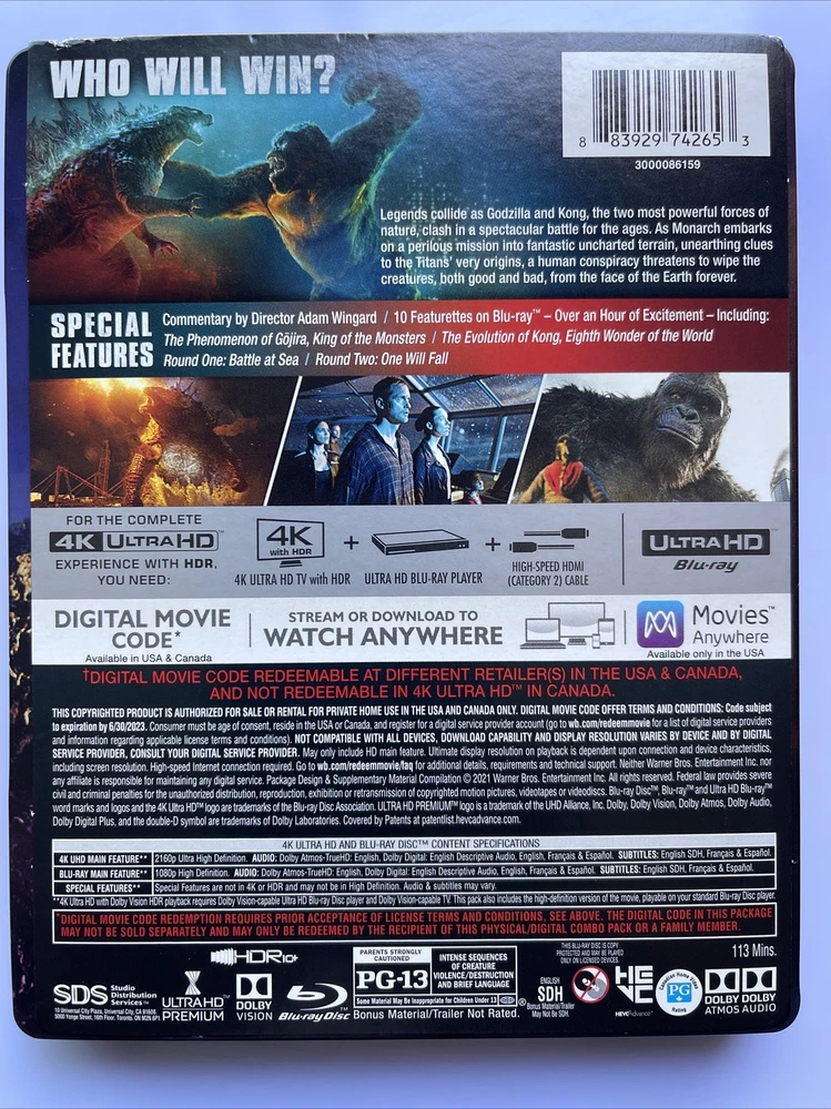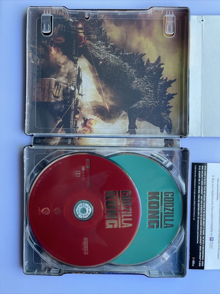 GODZILLA VS KONG. NO DIGITAL (4K Steelbook, Limited Edition) {Sold Out}. Opened for digital code only, basically brand new. NO DIGITAL CODE. Will come with J-Card, Discs were never used. Kept in steelbook protector. -MINOR DAMAGES- -J_Card is a little ripped. -Small dent on top of steelbook where j-card is ripped