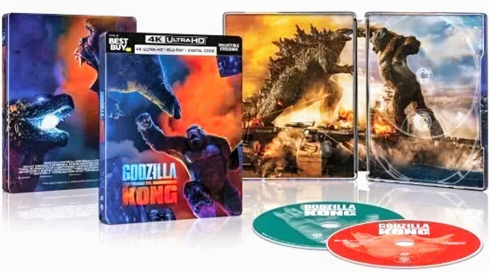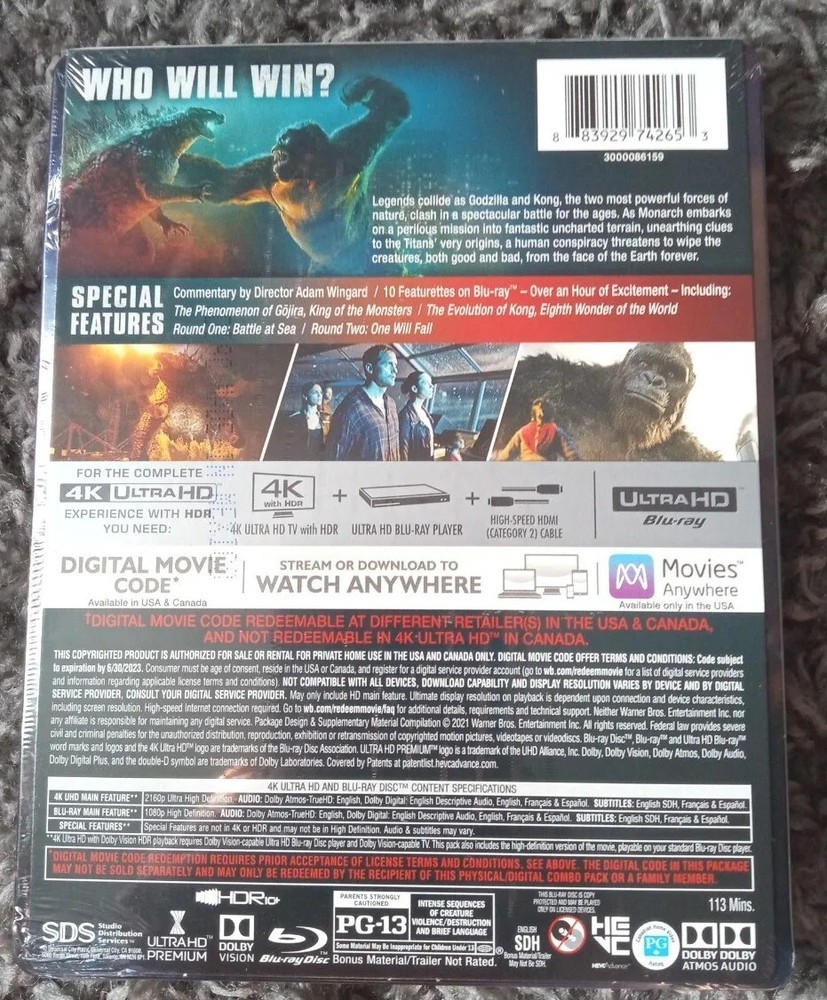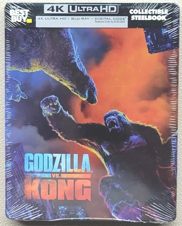 "100% satisfaction guaranteed. Delve into the epic showdown between the titanic monsters with the "Godzilla vs. Kong" Steelbook edition, a must-have for fans of the genre. Presented by Warner Bros., this 4K UHD Blu-ray offers a visually stunning experience of the Sci-Fi & Fantasy spectacle directed by Adam Wingard. With a run time of 113 minutes, this movie is rated PG-13 and comes with a host of special features, including an insightful commentary track." This Steelbook edition is not just a regular Blu-ray; it's a collector's treasure that's region-free, allowing you to enjoy the high-definition thrills no matter where you are. The disc includes English, French, and Spanish subtitles, catering to a diverse audience. Whether you're a creature feature aficionado or a collector of rare film editions, this Steelbook promises to be a standout piece in your collection.