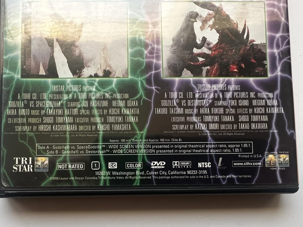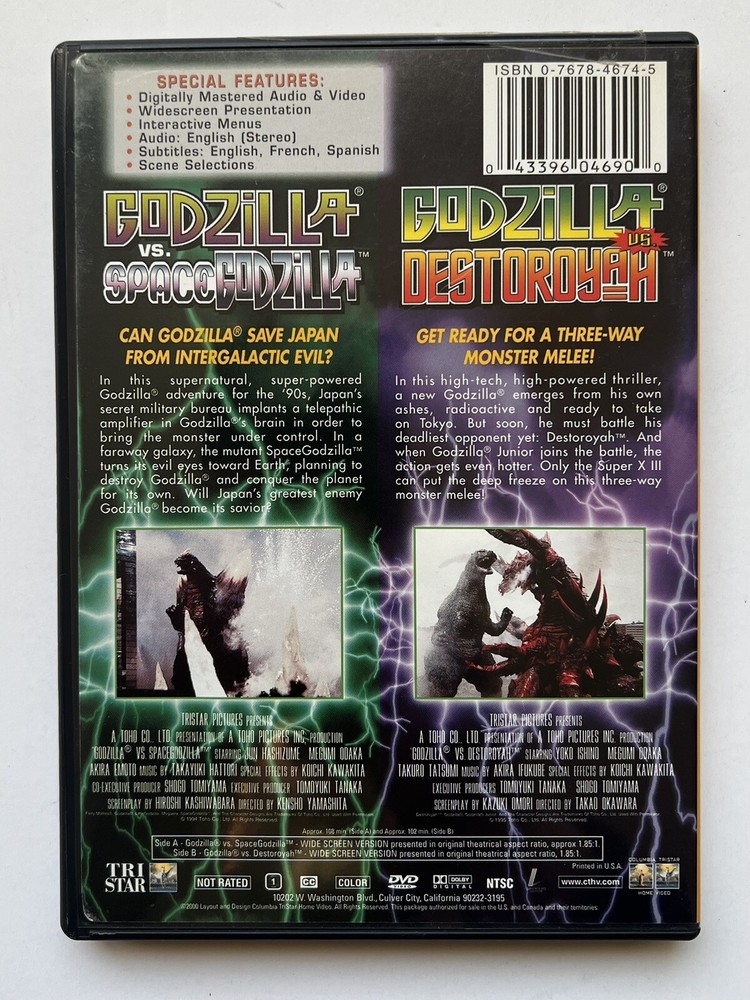 HI YOU ARE BIDDING ON A GODZILLA VS SPACE-GODZILLA & GODZILLA VS DESTOROYAH DOUBLE FEATURE DVD , DOUBLE SIDED DISC, EXTREMELY RARE, GOOD LUCK....FREE SHIPPING IN UNITED STATES EXCEPT HAWAII OR ALASKA....I Will NOT SHIP TO CANADA, I Will Only Ship Within USA
