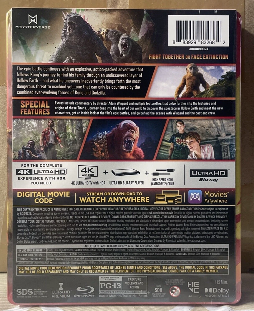 GODZILLA X KONG: THE NEW EMPIRE (4K UHD + BLU-RAY + DIGITAL* - EXCLUSIVE STEELBOOK™ EDITION) *** This item Brand New & Factory Sealed and Ready for immediate shipment*** Shipped with USPS Media Mail- Boxed and Bubble Wrapped *DIGITAL COPY SUBJECT TO EXPIRATION DATE WMT