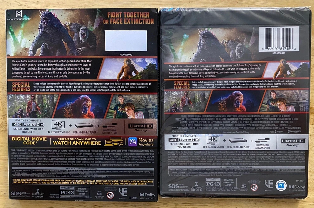 GODZILLA X KONG THE NEW EMPIRE 4K ULTRA HD ALSO INCLUDES SLIPCOVER SLEEVE FROM WARNER BROS. DISC IS MINT, SLIPCOVER DOES HAVE A FEW DINGS, DIGITAL HD CODE NOT INCLUDED OPENED CAREFULLY ON THE SIDE AND REMOVED. 100% AUTHENTIC AND ORIGINAL GUARANTEED. FAST SHIPPING WILL SHIP NEXT DAY AFTER PAYMENT CLEARS. ON HAND READY TO SHIP! THIS ITEM WILL SHIP IN A BOX!