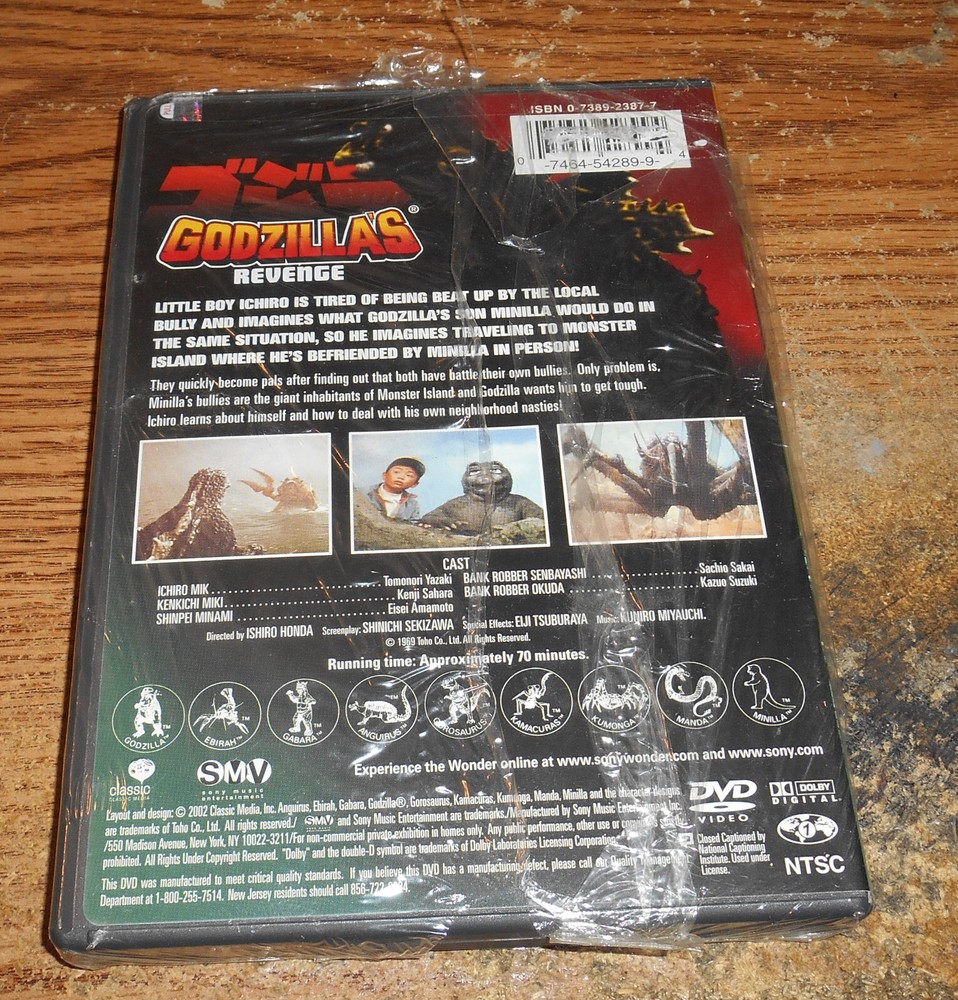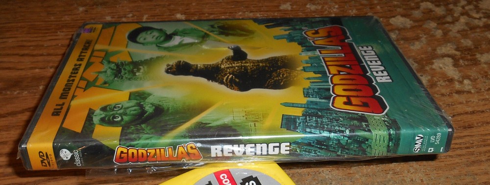 YOU ARE BIDDING ON A VERY HARD TO FIND GODZILLA'S REVENGE ALL MONSTERS ATTACK! DVD. DVD COMES TO YOU (NEW AND FACTORY SEALED). PLEASE NOTE THAT THERE IS TEARING TO THE SHRINK WRAP, AND THE BAR CODE ON THE BACK OF THE CASE HAS BEEN SCRATCHED OUT, WHICH TORE THROUGH THE OUTER PLASTIC ON THE BACK OF THE CASE. BUYER PLEASE ADD $5.13 FOR USPS MEDIA MAIL SHIPPING AND DELIVERY CONFIRMATION. DVD WILL BE SHIPPED WITHIN A DAY OR TWO OF RECEIPT OF PAYMENT. I COMBINE SHIPPING IF YOU PURCHASE MULTIPLE VHS TAPES/DVDS/CASSETTES.