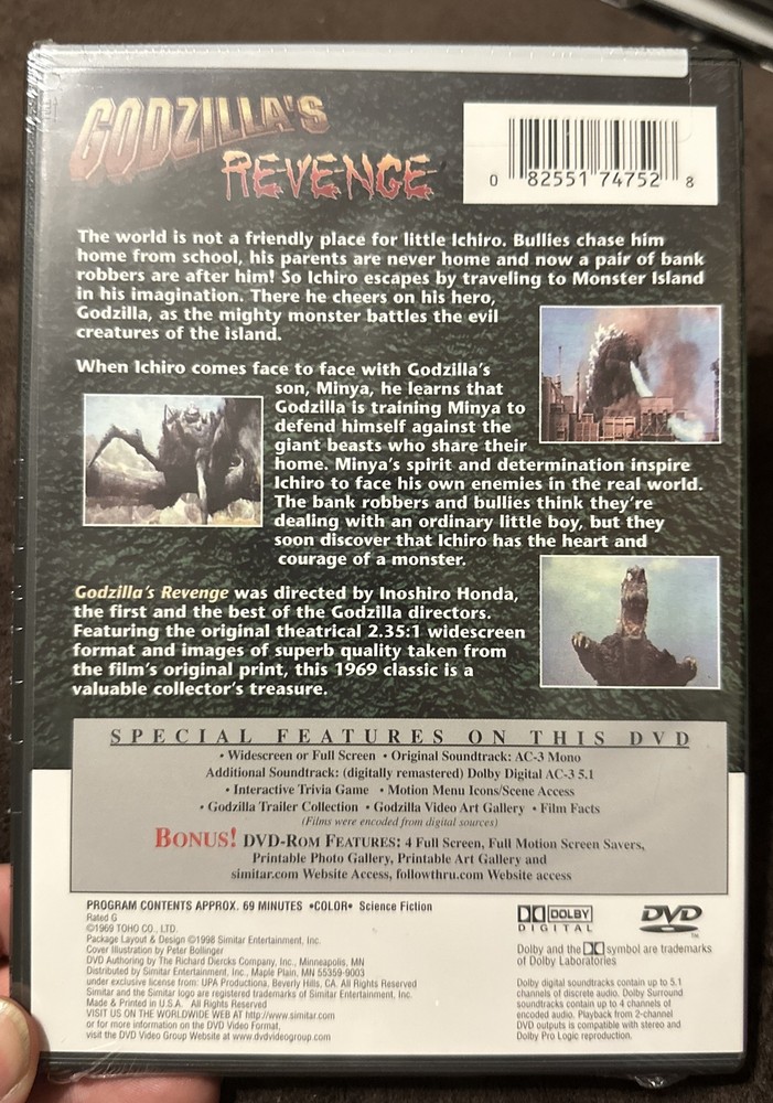 This DVD features the classic 1998 film "Godzilla's Revenge - All Monsters Attack," directed by Ishiro and Inoshiro Honda. Starring Kenji Sahara and rated G, this sci-fi and fantasy movie is a must-have for fans of the monster genre. The DVD is new and ready for your viewing pleasure, perfect for movie and TV enthusiasts. It's a great addition to any collection, and a perfect gift for those who love classic movies. Actual item pictured