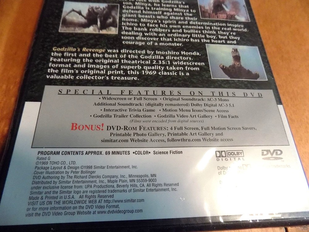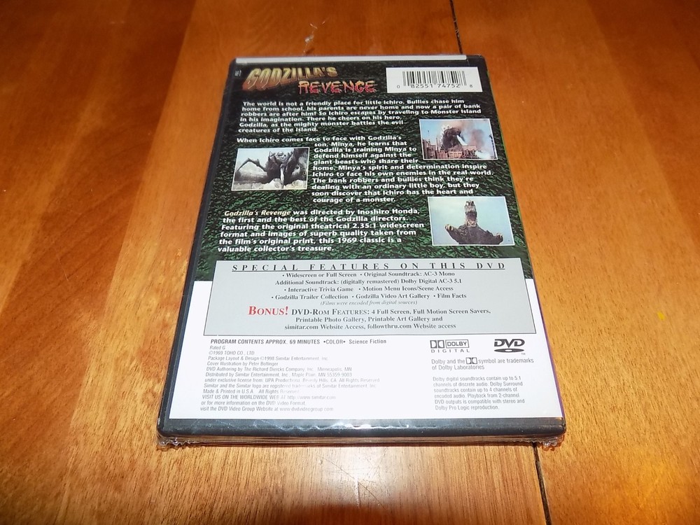 THIS IS AN UPDATE TO ALL MY CURRENT LISTINGS. -UNFORTUNATLEY, I SUFFERED A STROKE AND I AM RELYING ON MY FAMILY TO FIND, PACK AND SHIP THE INVENTORY. I FORMERLY HANDLED THE INVENTORY LOCATION BY MEMORY, AND YET HAVE NOT FOUND A WAY FOR THEM TO READ MY MIND. WE ALL WILL ENDEVOR TO LOCATE AND SHIP OUT AS FAST AS POSSIBLE. PLEASE BE GRACIOUS TO US DURING THIS PERIOD AS THERE IS NO POSITIVE CERTAINTY OF INVENTORY LOCATIONS. IF WE ARE EXPERIENCING DIFFICULTY FINDING YOUR PRODUCT, WE WILL COMMUNICATE VIA EBAY MESSAGES IN A TIMELY MANNER. IF WE CANNOT FIND THE PRODUCT YOU WILL RECEIVE A FULL REFUND. THANK YOU FOR UNDERSTANDING AND PLEASE CONSIDER THIS ISSUE BEFORE MAKING A PURCHASE. THIS IS AN UPDATE TO ALL MY CURRENT LISTINGS. -UNFORTUNATLEY, I SUFFERED A STROKE AND I AM RELYING ON MY FAMILY TO FIND, PACK AND SHIP THE INVENTORY. I FORMERLY HANDLED THE INVENTORY LOCATION BY MEMORY, AND YET HAVE NOT FOUND A WAY FOR THEM TO READ MY MIND. WE ALL WILL ENDEVOR TO LOCATE AND SHIP OUT AS FAST AS POSSIBLE. PLEASE BE GRACIOUS TO US DURING THIS PERIOD AS THERE IS NO POSITIVE CERTAINTY OF INVENTORY LOCATIONS. IF WE ARE EXPERIENCING DIFFICULTY FINDING YOUR PRODUCT, WE WILL COMMUNICATE VIA EBAY MESSAGES IN A TIMELY MANNER. IF WE CANNOT FIND THE PRODUCT YOU WILL RECEIVE A FULL REFUND. THANK YOU FOR UNDERSTANDING AND PLEASE CONSIDER THIS ISSUE BEFORE MAKING A PURCHASE. This is a great Godzilla classic film from 1969 now on DVD. The DVD is titled "Godzilla's Revenge" - the DVD features the film in both widescreen & full screen editions! The program features a little boy beset by bullies that escapes his troubles by traveling to monster island befriending the son of Godzilla - Minya. The program features classic Godzilla & Minya monster match-ups with the other monsters found on Monster Island. Ichiro learns a lesson in bravery eventually conquering his own bullies & thwarting some adult criminals to boot! A true classic Godzilla film you probably watched over and over. The DVD is new and still completely factory sealed. The DVD features a host of special features including wide & full screen versions, original soundtrack & a dolby remastered soundtrack, Interactive Trivia Game, Godzilla Trailer Collections, Screen Selections, Godzilla Video Art Gallery, Film Facts - BONUS DVD rom with 4 Full Screen, Full Motion - Screen Savers, Printable Photo Gallery, Printable Art Gallery, and more. The program has an approx. length of 69 minutes. A great classic Godzilla DVD - Godzilla's Revenge. Shipping via U.S. Postal Mail is $5.95 and includes US Postal Tracking. Thanks for looking!