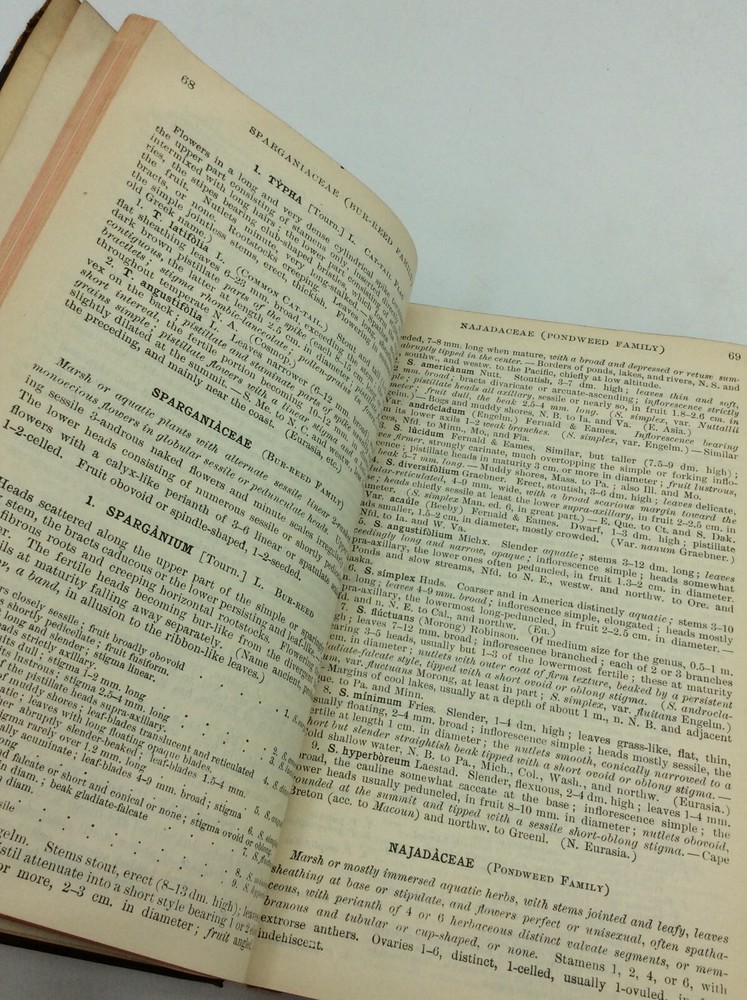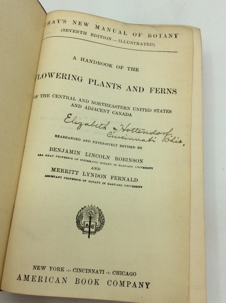 Benjamin Lincoln Robinson and Merritt Lyndon Fernald, rev. GRAY'S NEW MANUAL OF BOTANY: A Handbook of the Flowering Plants and Ferns of the Central and Northeastern United States and Adjacent Canada New York: American Book Company, 1908. 7th edition. Leather. 926p. A flexible hardcover book bound in full black leather. Good condition overall. Edges visible worn and spine lightly creased. Previous owner's initials written in marker on the top and bottom edges. Owner's bookplate inside front cover and signature on title page. Otherwise, text clean and binding tight. Item #310032 Vintage botanical guide with small in-text illustrations.