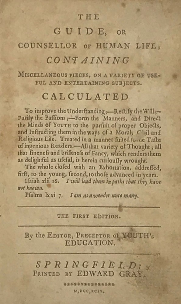 THE GUIDE, OR, COUNSELLOR OF HUMAN LIFE: Containing Miscellaneous Pieces, on a Variety of Useful and Entertaining Subjects Calculated to Improve the Understanding-Rectify the Will;-Purify the Passions;-Form the Manners, and Direct the Minds of Youth ... The whole closed with an Exhortation, addressed, first, to the young, second, to those advanced in years Title: THE GUIDE, OR, COUNSELLOR OF HUMAN LIFE: Containing Miscellaneous Pieces, on a Variety of Useful and Entertaining Subjects Calculated to Improve the Understanding-Rectify the Will;-Purify the Passions;-Form the Manners, and Direct the Minds of Youth ... The whole closed with an Exhortation, addressed, first, to the young, second, to those advanced in years Publication: Springfield, [MA]: Printed by Edward Gray, 1794 Description: First edition. 8vo. 17 cm. ix, [2], 12-191, [9] pp. Period full leather binding, tail of spine missing. Top of flyleaf torn off perhaps to remove signature. Stitching loose but holding. Seller ID: 64270 Subject: Americana We are a Washington, D.C. based bookstore in business for over 40 years. We specialize in Americana and general Antiquarian books. Terms All orders ship within three business days. Standard mail is USPS Priority Mail. Expedited and international shipping are also available. We offer combined shipping on multiple orders. All items are guaranteed to be as described or they may be returned within 30 days of receipt for a full refund. This listing was created by Bibliopolis.
