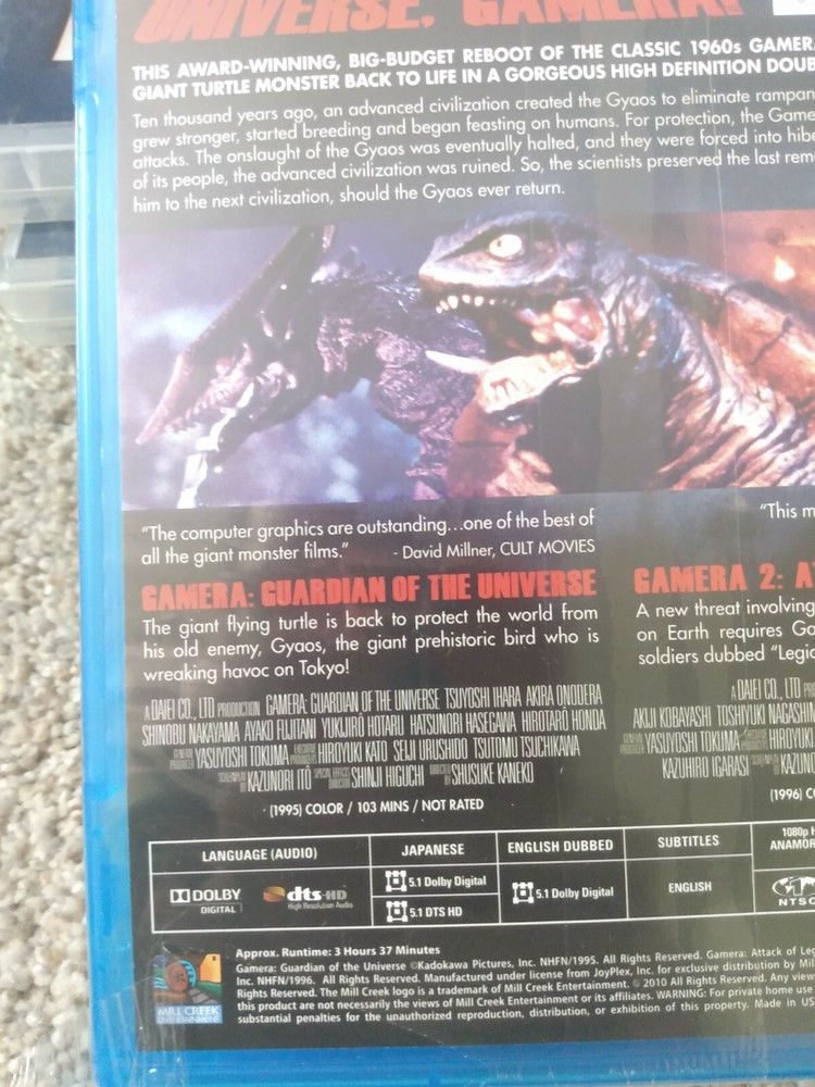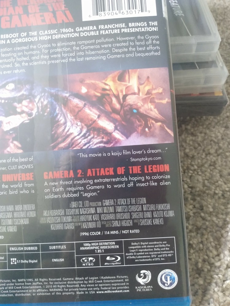 BRAND NEW AND SEALED SOME SHRINK WRAP IS PEELED, SEE PICTURES Product Information Japan's jet-propelled, fire-breathing giant turtle is on DVD and ready to take on all comers! This double feature offers a double punch of state-of-the-art special effects. Includes Gamera, Guardian of the Universe (Tsuyoshi Ihara. 1995/103 min.) and Gamera 2: Attack of the Legion (Toshiyuki Nagashima. 1996/114 min.). In Japanese with English subtitles. Color/NR/widescreen.