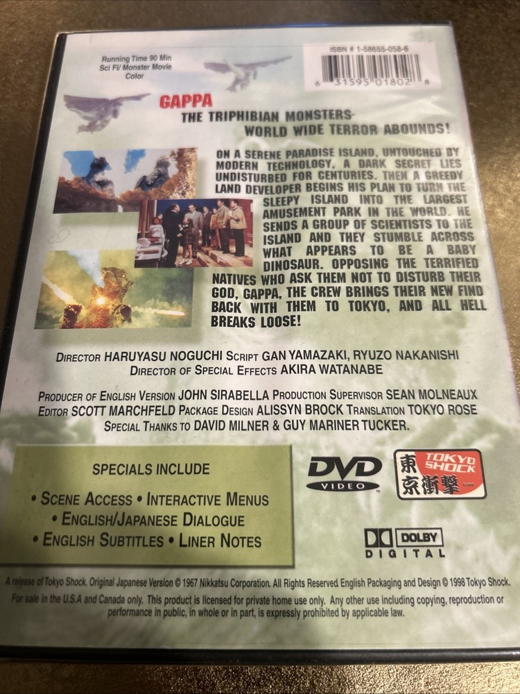 The natives of an untouched island paradise have kept the secret of their island to themselves for hundreds of years. However, a group of scientists and a greedy entrepreneur are making plans to turn this Eden into an amusement park (shades of JURASSIC PARK), and in the course of their research, they discover Gappa, a baby dinosaur, which they abduct from the island, thus provoking the wrath of Gappa's protective parents. A true classic from the country that specialized in giant monster features, GAPPA has easily earned a position alongside the better known classics of the genre like GODZILLA and MOTHRA.
