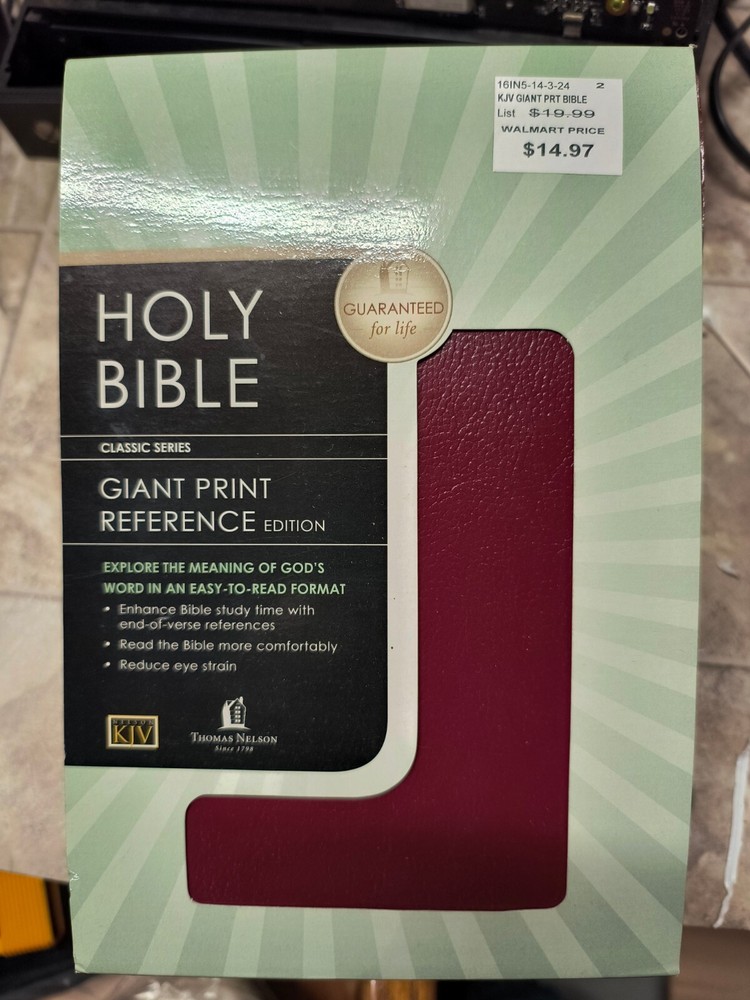 This Giant Print Reference Holy Bible in the King James Version is a must-have for anyone looking to deepen their understanding of the Bible. With its large type and trade paperback format, this textbook is easy to handle and read. The book was published in 2003 by Nelson Incorporated, Thomas, and contains 1408 pages. The Bible is written in English and illustrated by Yes. It covers a wide range of topics including the King James Version/Reférence and General. The book weighs 38.5 Oz and measures 9.8 inches in length, 6.6 inches in width, and 1.8 inches in height. This textbook is perfect for anyone who wants to explore the Bible in a deeper way. The Bible appears new but has some slight cover damage see pictures.