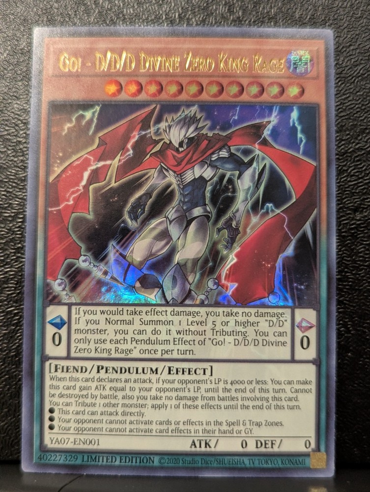 | Card Text | Pendulum Effect If you would take effect damage, you take no damage. If you Normal Summon 1 Level 5 or higher "D/D" monster, you can do it without Tributing. You can only use each Pendulum Effect of "Go! - D/D/D Divine Zero King Rage" once per turn. Monster Effect When this card declares an attack, if your opponent's LP is 4000 or less: You can make this card gain ATK equal to your opponent's LP, until the end of this turn. Cannot be destroyed by battle, also you take no damage from battles involving this card. You can Tribute 1 other monster; apply 1 of these effects until the end of this turn. • This card can attack directly. • Your opponent cannot activate cards or effects in the Spell & Trap Zones. • Your opponent cannot activate card effects in their hand or GY. |