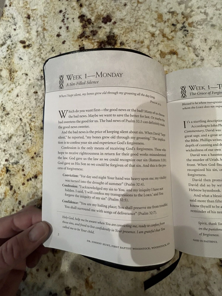 "God is Faithful~My Daily Devotional" is a first edition devotional book by Johnny Hunt, published in 2014 by Thomas Nelson. The book is bound in black faux leather and has 328 pages of English language content on religious and spiritual topics. The book measures 8.75 inches in length, 6.8 inches in width, and 0.75 inches in height. The narrative type of the book is nonfiction and the intended audience is young adults and adults. The book is categorized under "Books & Magazines" and "Books" and was manufactured in China. The book title, "God is Faithful", and the book series, "Historical", are some of the aspects that make this book a must-have for those who are interested in devotional books. This book is not personalized and is not signed.