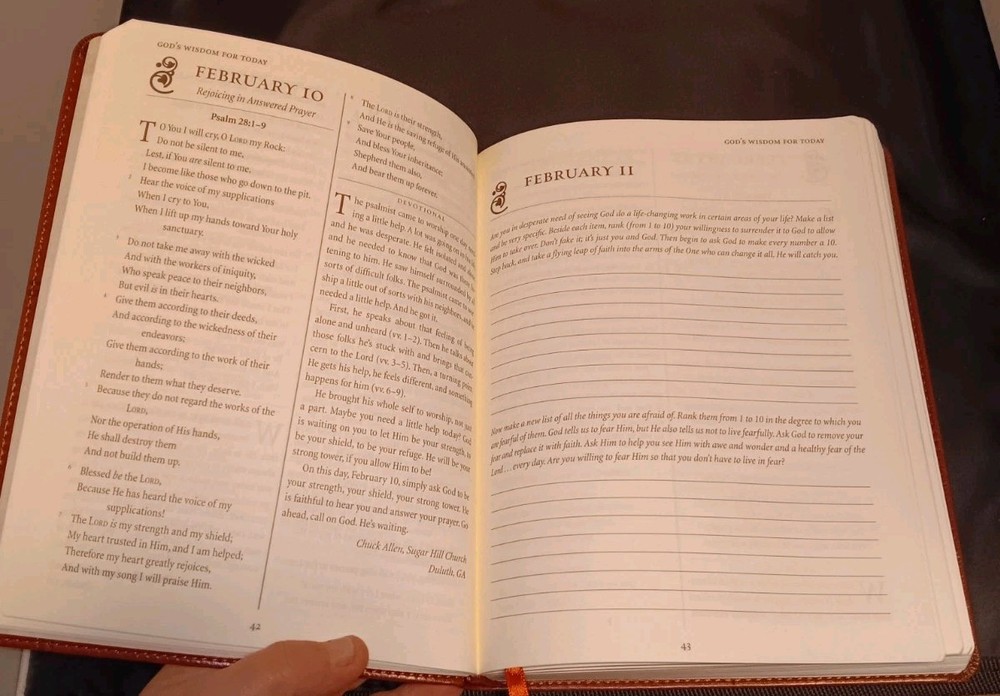 This devotional book, "God's Wisdom for Today" from the "My Daily Scripture" series by Thomas Nelson Inc, is a great addition to your collection. Written by Johnny Hunt, this trade paperback features 374 pages of inspiration and guidance for your daily life. Item is preowned and has been well-maintained. The only page written on is the dedication page in the front, I forgot to take a photo of it. See pics for other details. With a beautiful faux leather bound cover and large print, this book is not only functional but also aesthetically pleasing. It includes transparencies and is leather bound, making it a durable and long-lasting investment. The book was published in 2013 and is written in English. It belongs to the Religion and Philosophy genre and the topic includes General and Christian Life/Devotional. This book was manufactured in China.