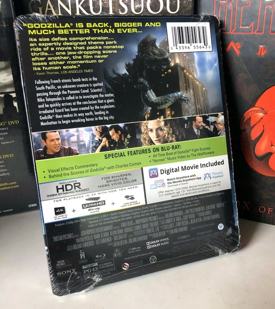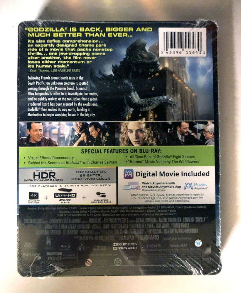 Godzilla (1998) 4K ULTRA HD + BLU-RAY Sony Pictures | 1998 | 139 min | Rated PG-13 | May 14, 2019 BEST BUY EXCLUSIVE STEELBOOK LIMITED EDITION US RELEASE STEELBOOK KETP IN A PROTECTIVE CLEAR SLEEVE SHELL SINCE PURCHASE DATE - SHELL INCLUDED A giant, reptilian monster descends upon New York, and it's up to the Army and an odd team of investigators to save their city. Following the French atomic bomb tests in the South Pacific, an unknown creature is spotted passing westward through the Panama Canal. Scientist Niko Tatopolous is called in to investigate the matter, and he quickly arrives at the conclusion that a giant, irradiated lizard has been created by the explosions. Godzilla then makes its way north, landing at Manhattan to begin wreaking havoc in the big city. Even with the combined forces of the U.S. military to fight the monster, will it be enough to save the people of New York? Director: Roland Emmerich Writers: Ted Elliott, Terry Rossio, Dean Devlin, Roland Emmerich Starring: Matthew Broderick, Jean Reno, Maria Pitillo, Hank Azaria, Kevin Dunn, Michael Lerner Producer: Dean Devlin Highly Collectible Rare Best Buy Exclusive Limited Edition Condition: Brand new factory sealed and all factory released stickers attached Digital Copy: Due to the release date, digital copy if included might be expired Shipping: We ship movies in secure shipping box to avoid damages SteeBook: Included in "MINT" condition, No visible signs of dings, bent, rips or lose discs (See Pictures) STEELBOOK HAS BEEN VISUALLY INSPECTED AND THERE ARE NO MAJOR DEFECTS. STEELBOOKS MIGHT HAVE MICRO-DENTS OR SCRATCHES OR OTHER FLAWS UNDER THE PLASTIC WRAP AND/OR THE BACK INFORMATION J-CARD, DATA CARD OR THE SLIPCOVER. DISCS MIGHT COME LOOSE DURING SHIPMENT.