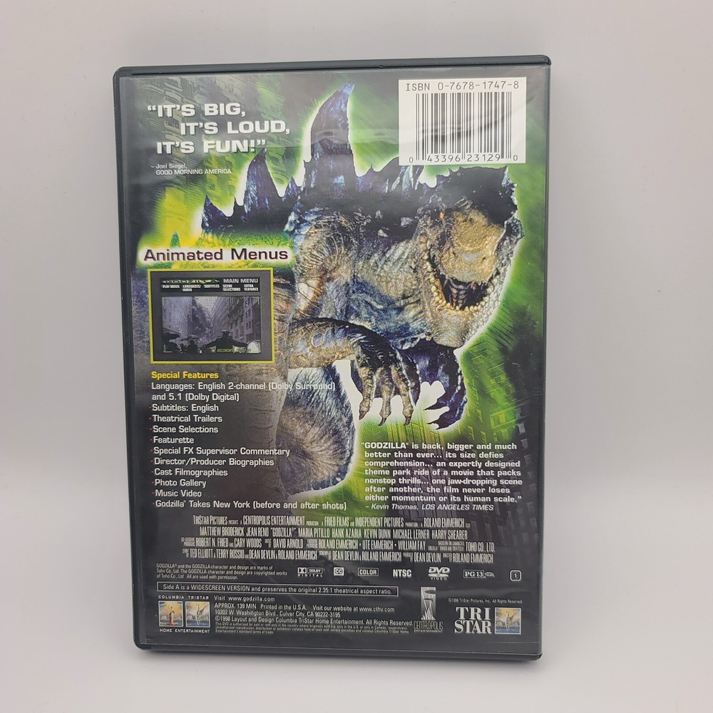 Delve into the thrilling world of "Godzilla (1998 film)" with this Special Edition DVD Deluxe Widescreen Edition. Experience the action-packed adventure in stunning widescreen format, enhanced with exclusive special features that bring you closer to the making of this cinematic masterpiece. Sony Pictures has crafted a memorable journey through the lens of disaster, creatures, and fantasy, making it a must-have for fans of the genre. Join Matthew Broderick as he brings to life the iconic monster that reigns chaos in this PG-13 rated adventure. This DVD comes packed with additional features including a behind-the-scenes featurette and commentary that provide an in-depth look at the creation and impact of one of the most beloved creatures in movie history. Whether you're a Godzilla aficionado or a newcomer to the saga, this edition is a comprehensive exploration of the 1998 classic.