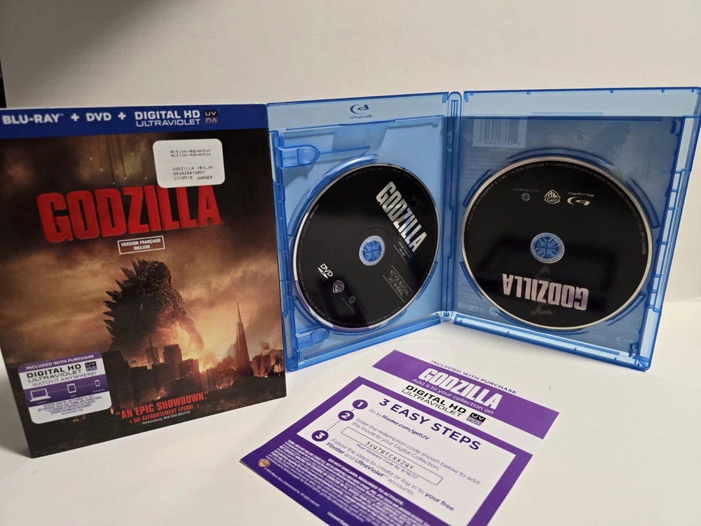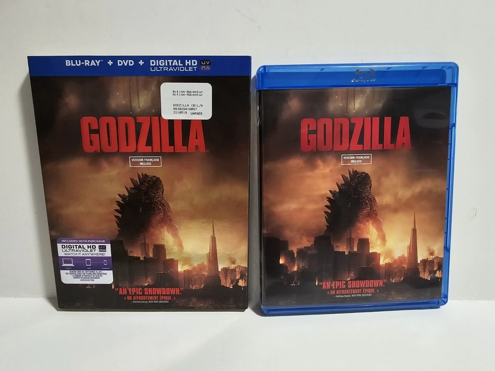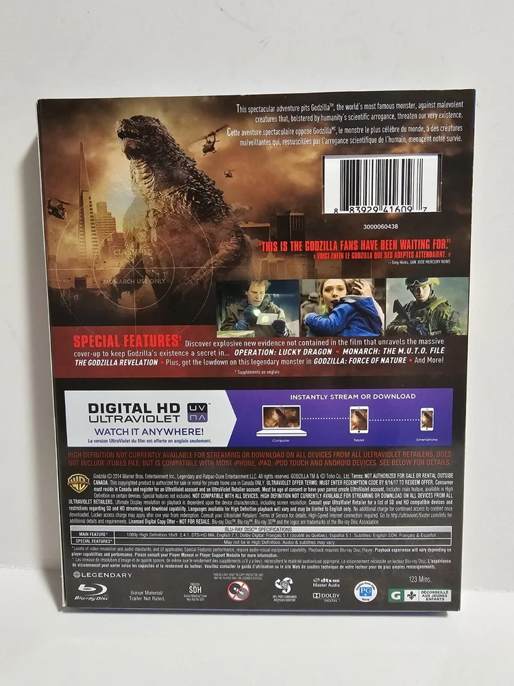 Get ready for an epic adventure with the 2014 blockbuster hit "Godzilla". This Blu-ray disc set includes two discs with both Blu-ray and DVD formats, and comes with a sleek slipcover for safekeeping. Experience the thrill of the action-packed and fantasy-filled film in English or French language options. This movie is perfect for fans of the action and fantasy genres. Don't miss out on this exciting addition to your movie collection.