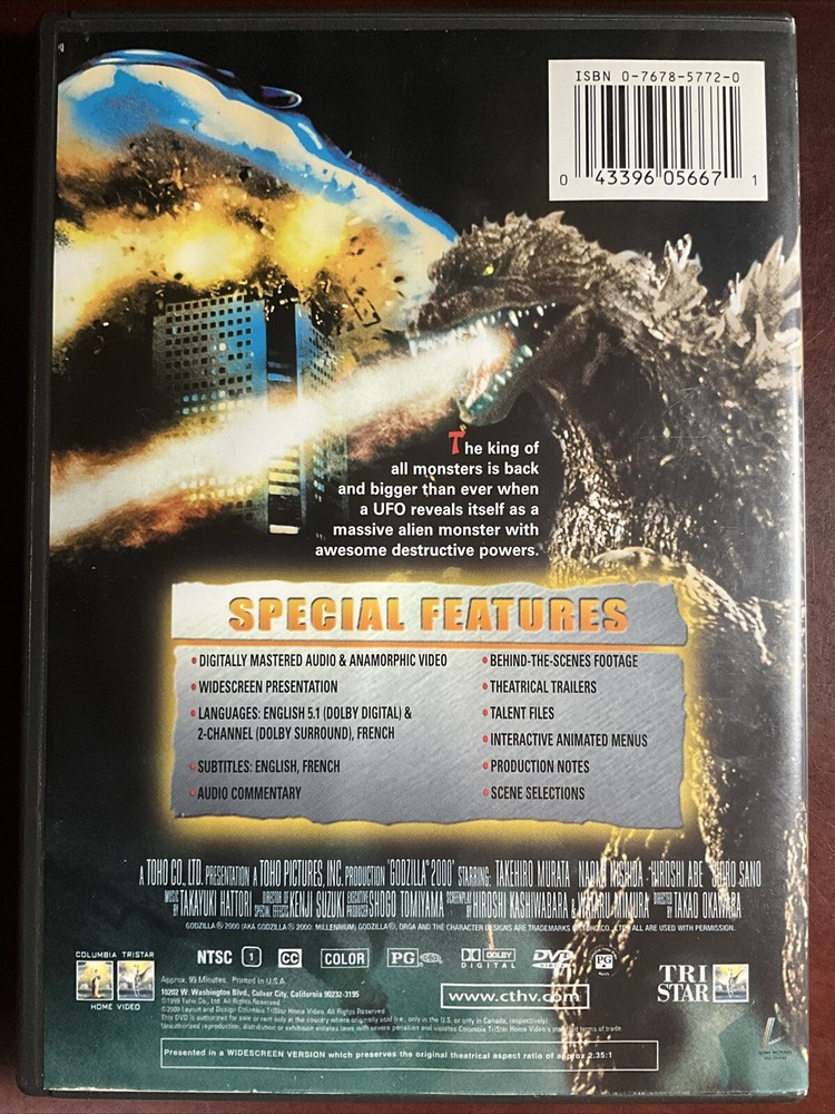 Get ready for an exciting adventure with Godzilla 2000 on DVD! This classic sci-fi monster film, directed by Takao Okawara and produced by Toshihiro Ogawa, is a must-see for fans of the genre. Released in 1999 by Sony Pictures, this DVD features a run time of 99 minutes and a PG rating. With a sub-genre of horror-monsters and a genre of sci-fi-contemporary, Godzilla 2000 is a thrilling addition to any movie collection. The DVD format ensures high-quality viewing and the movie/TV title is a timeless classic. Don't miss out on this opportunity to own a piece of movie history! You are bidding on a used DVD, this The DVD is in good condition. The above pictures are for reference only. The DVD might be full-screen or widescreen. The DVD may be standard edition or special collector edition. There may be additional stickers on the DVD. The DVD all are in good condition and it is the luck of the draw of what I have in stock.