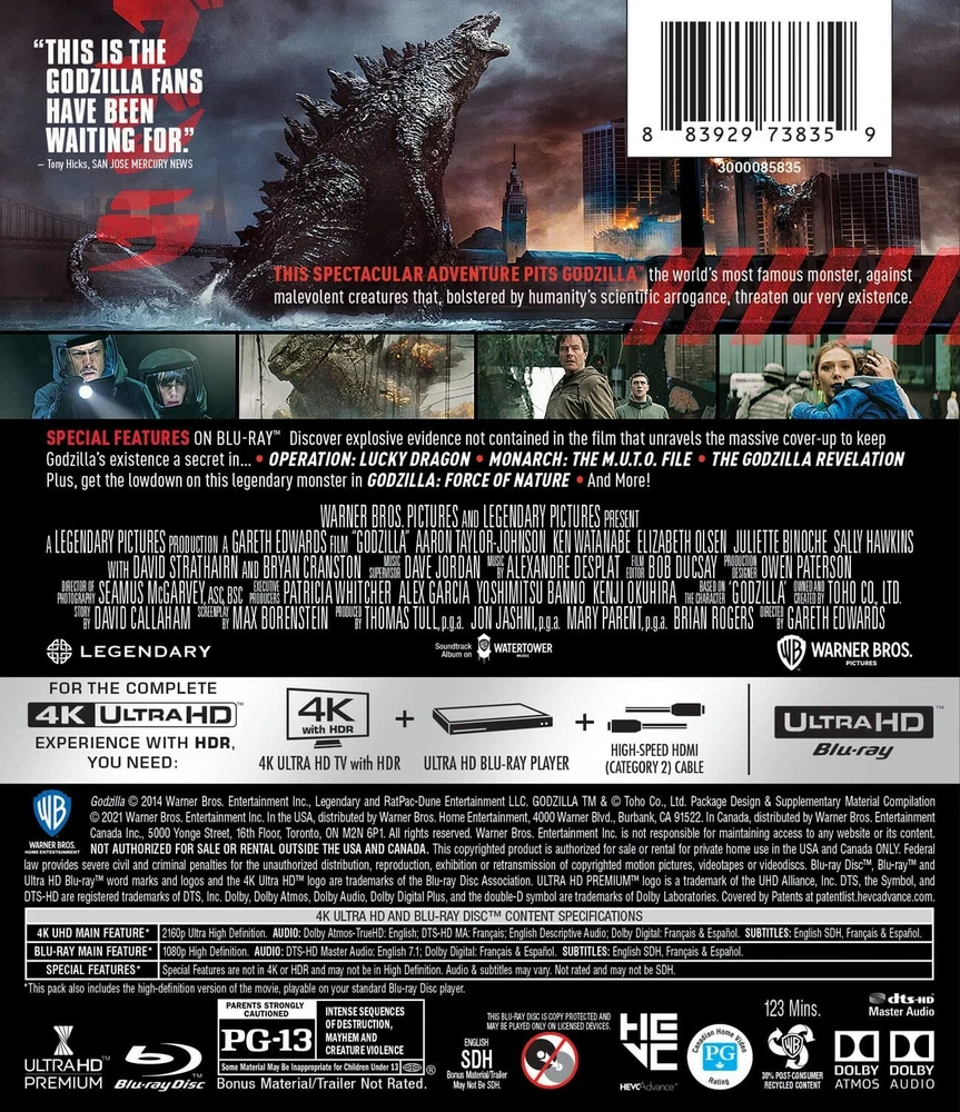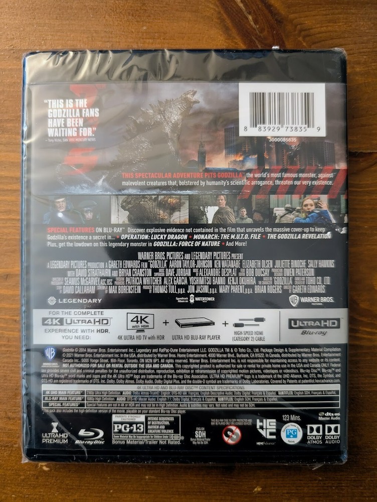 Brand NEW & SEALED!!! Genuine & Authentic. Free Shipping. Will ship out within 24 hours. Godzilla is a 2014 American monster film directed by Gareth Edwards. Produced by Legendary Pictures and distributed by Warner Bros. Pictures, it is a reboot of Toho's Godzilla franchise, and the first film in Legendary's Monsterverse franchise. It is the 30th film in the Godzilla franchise, and the second Godzilla film to be completely produced by a Hollywood studio. The film stars Aaron Taylor-Johnson, Ken Watanabe, Elizabeth Olsen, Juliette Binoche, Sally Hawkins, David Strathairn, and Bryan Cranston. MPAA rating : NR (Not Rated) Director : Gareth Edwards Media Format : 4K Run time : 75 minutes Release date : March 23, 2021 Actors : Aaron Taylor-Johnson, Ken Watanabe, Elizabeth Olsen, Juliette Binoche, Sally Hawkins Producers : Thomas Tull, Patricia Whitcher, Alex Garcia, Jon Jashni, Yoshimitsu Banno Studio : Warner Bros. Writers : Max Borenstein Country of Origin : USA Number of discs : 2