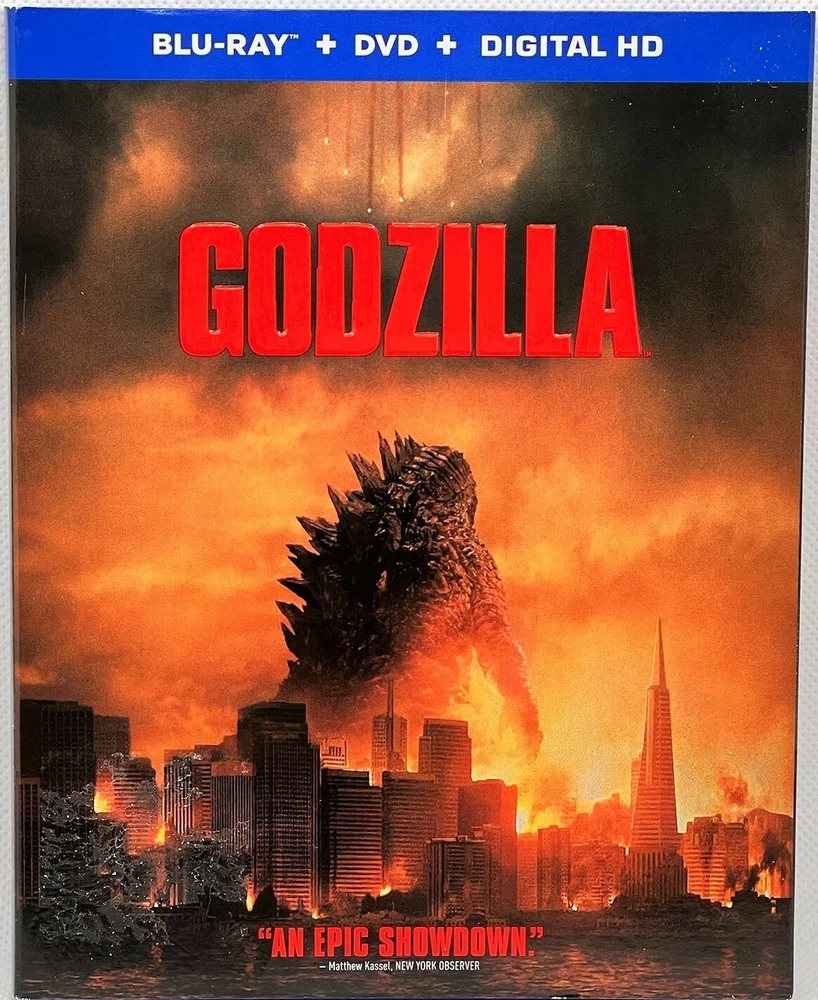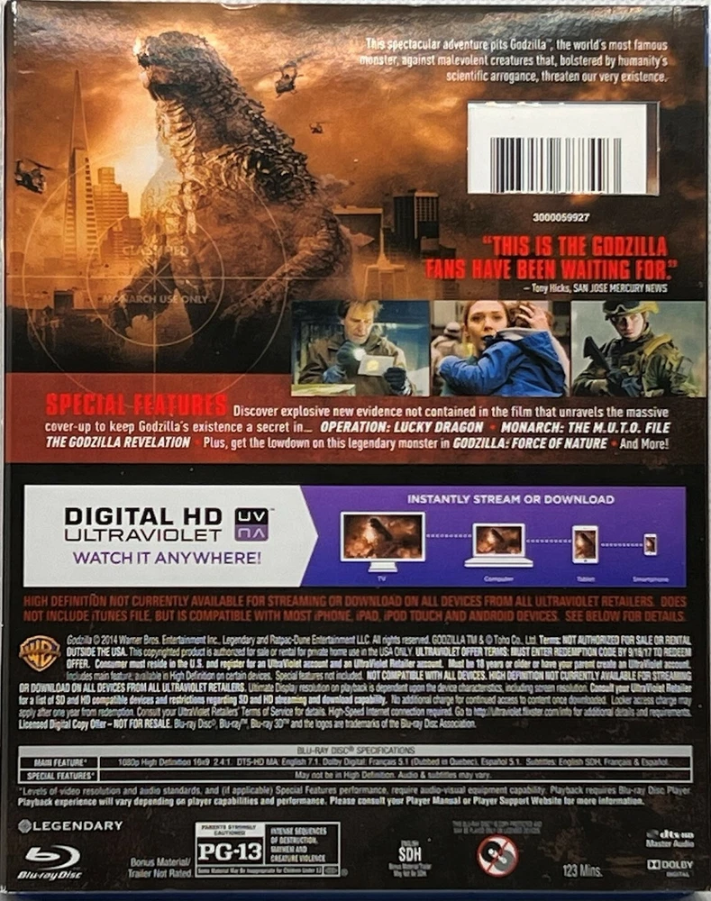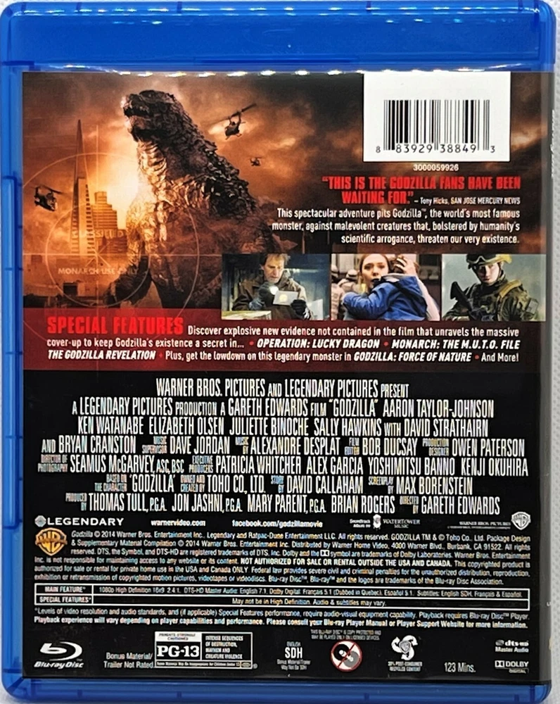 Godzilla (2014) BLU-RAY Gareth Edwards(DIR) with Slip Cover. Warner Bros. | 2014 | 123 min | Rated PG-13 | Sep 16, 2014 Video Codec: MPEG-4 AVC (23.69 Mbps) Resolution: 1080p Aspect ratio: 2.40:1 Original aspect ratio: 2.39:1 Audio English: DTS-HD Master Audio 7.1 (48kHz, 24-bit) French (Canada): Dolby Digital 5.1 Spanish: Dolby Digital 5.1 Subtitles English SDH, French, Spanish Discs Blu-ray Disc Two-disc set (1 BD-50, 1 DVD) DVD copy Digital Digital copy expired Packaging Slipcover in original pressing Embossed print Playback 2K Blu-ray