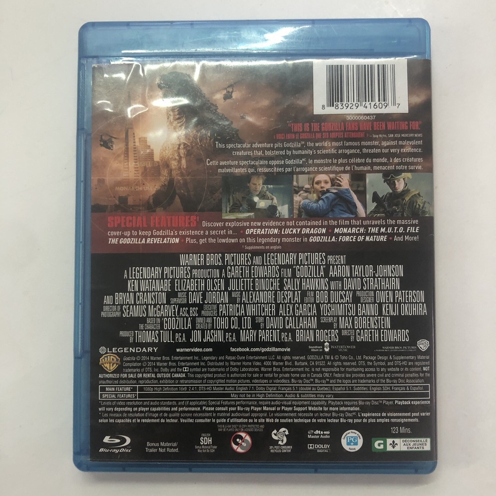 Godzilla 2014 Directed by Gareth Edwards Written by Max Borenstein, Dave Callaham Starring Aaron Taylor-Johnson Ken Watanabe Elizabeth Olsen Juliette Binoche Sally Hawkins David Strathairn Bryan Cranston Richard T. Jones Victor Rasuk CLICK HERE TO VIEW GODZILLA 2014 MOVIE TRAILER OVERALL CONDITION: VERY GOOD *See Photos. The item in the photos is the item you will receive.* FORMAT: BLU RAY format for players in CANADA & USA REGION