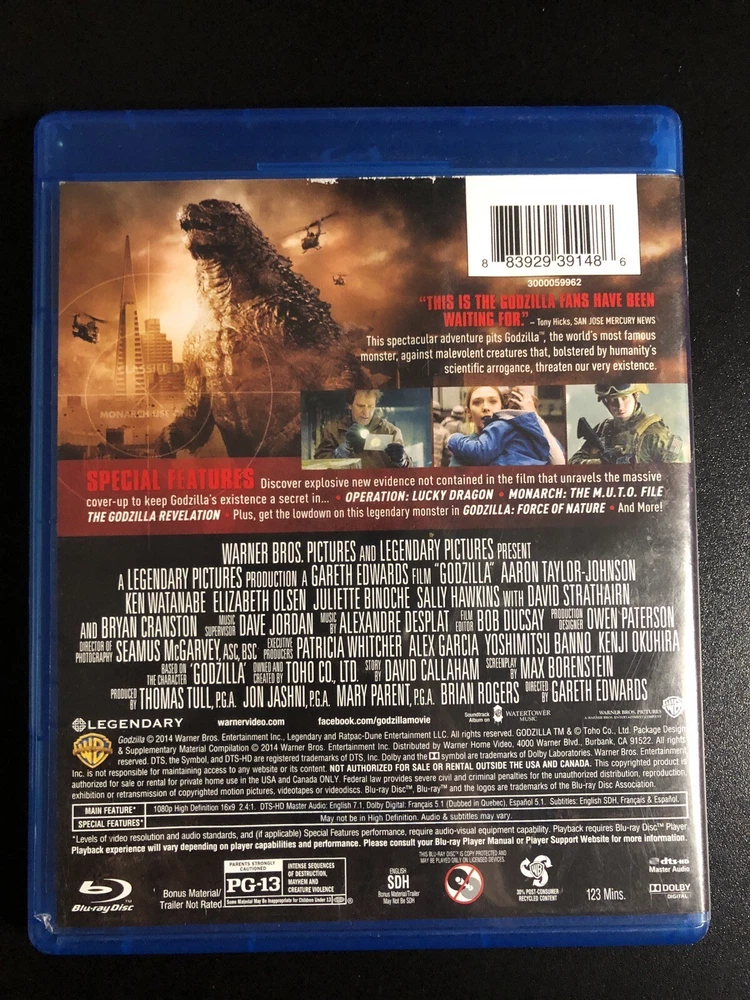 Greetings, Kaiju enthusiasts! Behold the colossal might of "Godzilla" (2014) in stunning high-definition with this Blu-ray edition. Own a piece of monster movie history and experience the awe-inspiring power of Godzilla like never before. Key Features: 📀 Format: Blu-ray 🦖 Epic Godzilla Film: The 2014 reboot delivers jaw-dropping monster action on a colossal scale. 🌟 High-Definition: Immerse yourself in the Kaiju chaos with crystal-clear visuals and immersive sound. 🎬 Collector's Item: A must-have for Godzilla fans – bring the King of the Monsters into your home! 📸 Photos: Check out detailed images showcasing the pristine condition. Why You'll Love This Blu-ray: 🔥 Witness Godzilla's return to the big screen in all its glory – a cinematic spectacle that demands to be experienced in high definition. 🌍 The Blu-ray format ensures a visual and auditory experience that captures the enormity and power of the legendary creature. 🎥 Add this "Godzilla" Blu-ray to your collection for a thrilling movie night filled with monster-sized excitement. What's Included: "Godzilla" (2014) Blu-ray Condition: The Blu-ray is in excellent condition, promising a flawless and immersive viewing experience. Refer to the photos for a closer look. Shipping: Rest assured, your Blu-ray will be securely packaged for safe and swift delivery. Fast and reliable shipping guaranteed! Don't miss the chance to own this iconic "Godzilla" (2014) Blu-ray! Bid now and bring the King of the Monsters home for an unforgettable movie night! Note to Buyers: Feel free to reach out if you have any questions or need additional information.