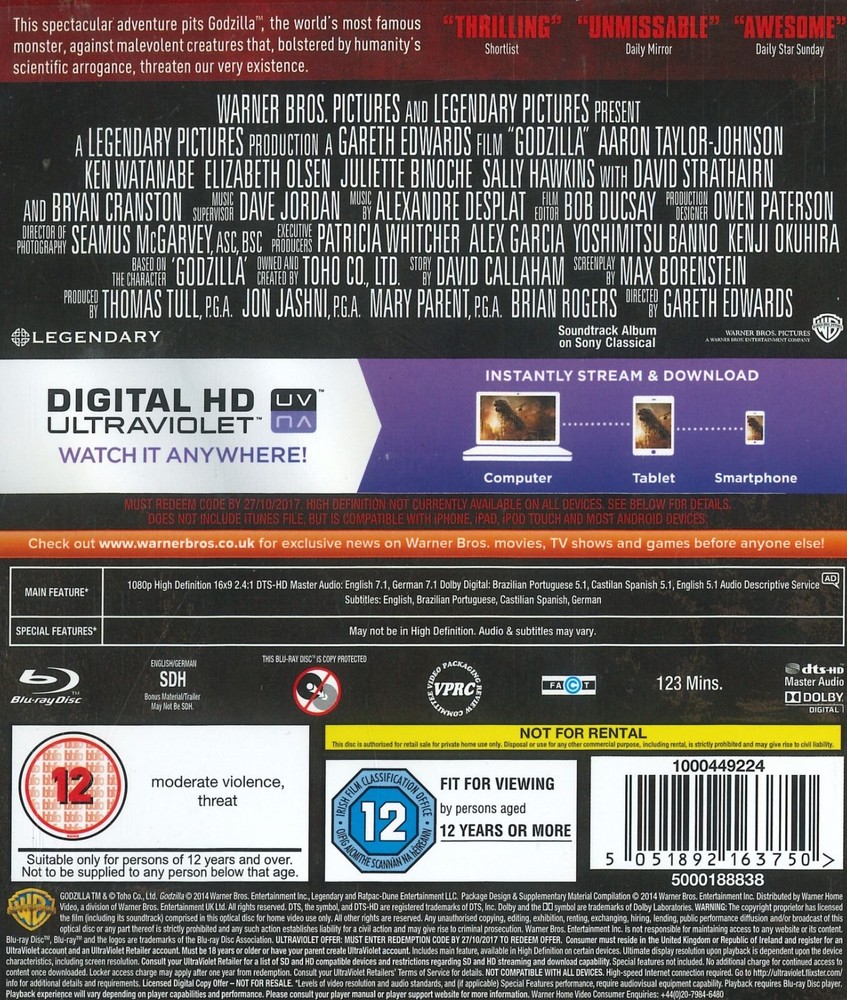 Godzilla (2014) Blu-ray Used, working condition. This Blu-ray is only compatible with region B Blu-ray players. In stock now, fast delivery. Price is VAT inclusive - VAT invoice dispatched with goods. Godzilla (2014) Blu-ray Used, working condition. This Blu-ray is only compatible with region B Blu-ray players. In stock now, fast delivery. Price is VAT inclusive - VAT invoice dispatched with goods.