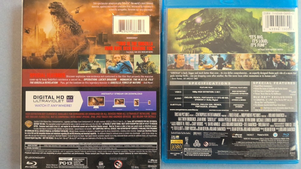 The product is a Blu-ray and DVD combo of the 2014 film "Godzilla," directed by Gareth Edwards. The release includes the main feature film along with the bonus Blu-ray of the 2009 film "GODZILLA." The movie is in English. It falls under the Science Fiction genre with a sub-genre of Horror, and has a PG-13 rating. Warner Home Video is the studio behind this release.