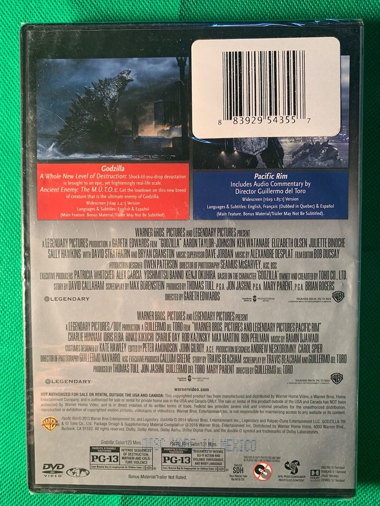 This 2-disc set includes the action-packed movies Godzilla (2014) and Pacific Rim (2013) on DVD. Enjoy the thrilling battles between giant monsters and robots in stunning visual effects. The set features movies from the categories of Movies & TV and DVDs & Blu-ray Discs, and includes aspects such as Format (DVD), Release Year (2013), Color (Y), Movie/TV Title (Godzilla), and Studio (Warner Bros.). Upgrade your movie collection with this exciting bundle!