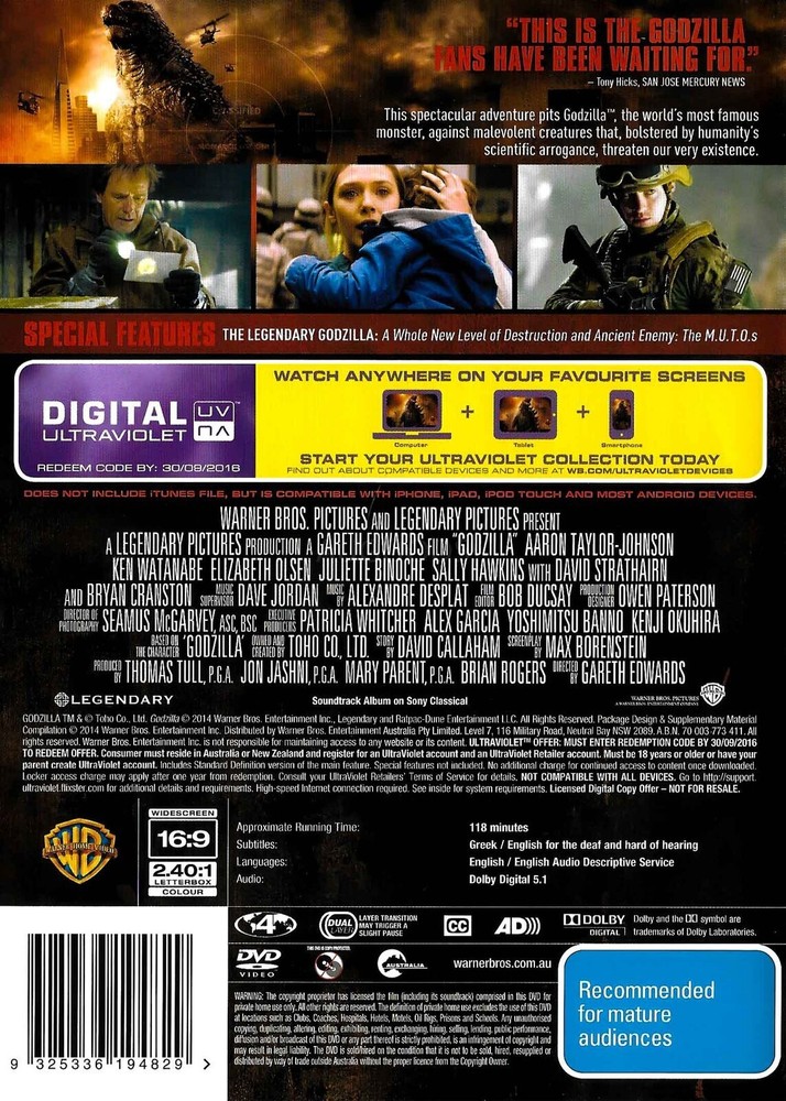 FAST SHIPPING HASSLE FREE RETURNS SECURE PAYMENT EXCELLENT SERVICE All Movies DVDs Blu-Rays CDs Video Games Books Godzilla (2014) (+UV) DVD Action Aus Stock Disc Like New Shipping Please make sure to double check your shipping and address information before you confirm and pay. Where do you ship? Currently, we ship online purchases Australia wide. We also offer International shipping for our customers overseas. How long till my item gets dispatched? In most cases, orders made before 2 PM will be dispatched same day or on the next business day. How are my items sent? We use Australia Post for standard, registered and express shipping for orders up to 21kg. We offer various postage options: Free Postage: Standard post Domestic Regular Letter- Untracked $2.99: Standard Domestic Regular Letter with Tracking $8.99: Australia Post Express Parcel With Tracking Payment How can I pay for my item? We offer convenient, safe and speedy payment via PayPal. PayPal helps protect your information with industry-leading security and for protection systems. When you use PayPal, your financial information is never shared with the 3rd party merchant. Within PayPal you may have the option to pay with a Credit Card, Bank Account, eCheck, or other payment options. Returns Can I return my items? Yes. We accept accepts returns on Damaged or incorrect orders for up to 30 days. Faulty or Damaged Items If your item arrives faulty or not as described then you can return it to us within 30 days of purchase for a full refund. Changed your mind? If you change your mind about your item, As long as the item is still in factory sealed new condition it may be sent back to us within 30 days of purchase. The item must still be in its original condition and packaging.In these cases the customer will be responsible to pay the return postage. DESCRIPTION Godzilla (2014) (+UV) Region: 4 This spectacular adventure pits Godzilla, the world's famous monster, against malevolent creatures that, bolstered by humanity's scientific arrogance, threaten our very existence. \n GUARANTEE We guarantee all items are genuine studio release products - no copies, counterfeit or faulty versions. If there is an issue with the playback of the item (the item is faulty), please contact us within 7 days of receipt so that we can resolve the issue for you. Please note, this does not include instances where you've purchased say, a region 2 DVD and it won't play in your region 4 player. You must check first that your player can play the region of the disc you are about to purchase. CANCELLATION I Have already checked out, can I cancel my order? We will be able to cancel your order if it has not been dispatched yet. Send us a message as soon as possible and we will do our best to cancel your order before it gets sent out. My order has been dispatched, can I cancel my order? If your item has already been sent out, you are able to return it to us under our Return Policy. As long as the item is still in factory sealed new condition it may be sent back to us within 30 days of purchase. The item must still be in its original condition and packaging.In these cases the customer will be responsible to pay the return postage. CONTACT More Questions? If there is any problem, please contact us. We would rather issue a refund or a replacement item than have an unhappy customer. Our customers come first and we would love to hear from you. Feel free to CONTACT US at any time with any questions or concerns and we will be more than glad to assist you. Copyright © | All Rights Reserved