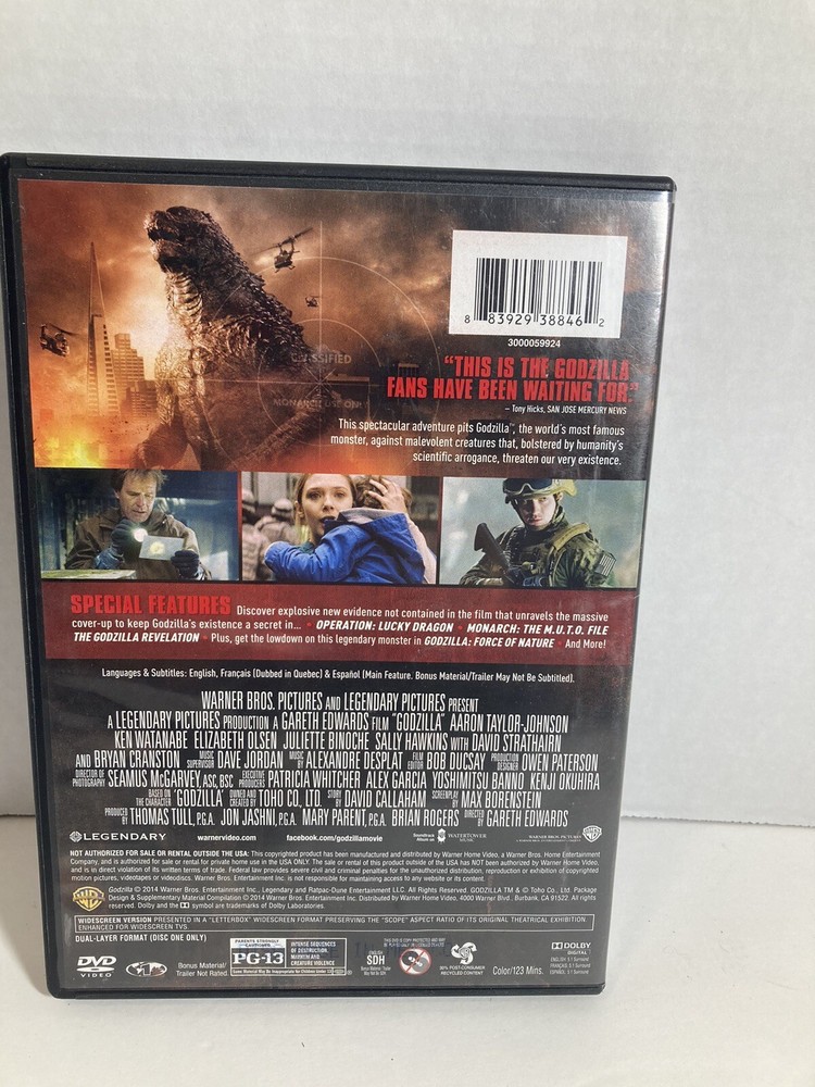 This 2-disc special edition DVD of the 2014 sci-fi contemporary movie "Godzilla" directed by Gareth Edwards is a must-have for any movie collector. This edition includes special features and is available in English language with English, French, and Spanish subtitle options. The DVD is formatted for North American players and is rated PG-13. It is a perfect addition to any movie and monster enthusiast's collection.