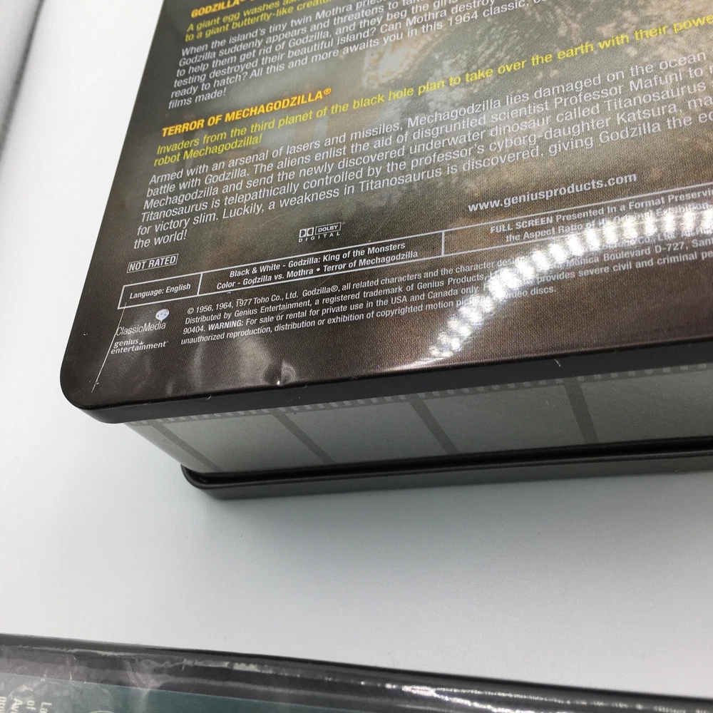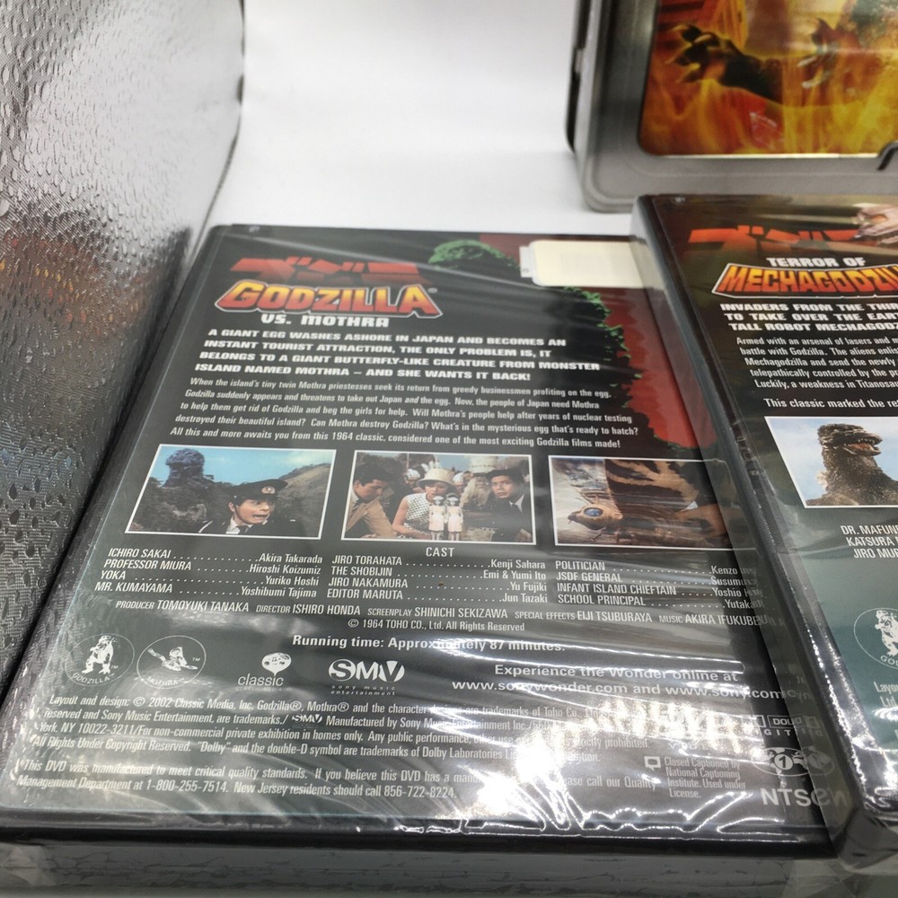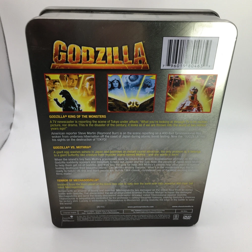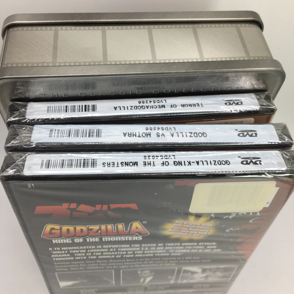 This Godzilla 3 DVD Classic Collection Tin Box is the perfect addition to any movie lover's collection. The three movies are as following: Godzilla King of the Monsters, Godzilla vs. Mothra, and Terror of Mechagodzilla. The collection is directed by Ishiro Honda and stars Steve Martin as the lead actor. The sci-fi & fantasy genre is perfect for fans of boxing sub-genres. The DVDs are sealed and come in the original packaging. This item is a must-have for any Godzilla or Genius Entertainment studio collector.