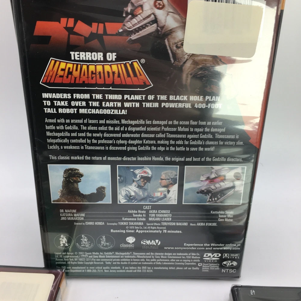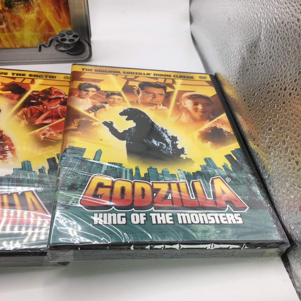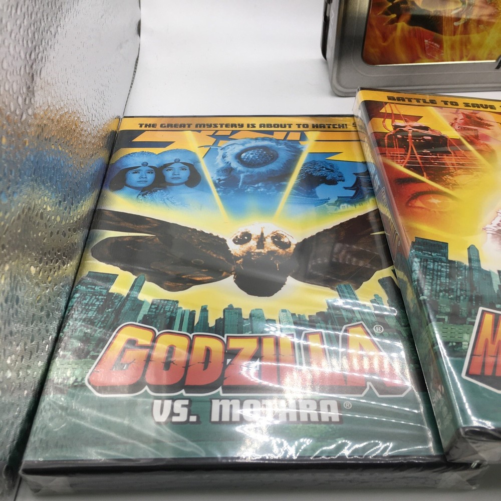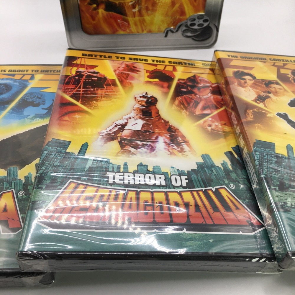 This Godzilla 3 DVD Classic Collection Tin Box is the perfect addition to any movie lover's collection. The three movies are as following: Godzilla King of the Monsters, Godzilla vs. Mothra, and Terror of Mechagodzilla. The collection is directed by Ishiro Honda and stars Steve Martin as the lead actor. The sci-fi & fantasy genre is perfect for fans of boxing sub-genres. The DVDs are sealed and come in the original packaging. This item is a must-have for any Godzilla or Genius Entertainment studio collector.