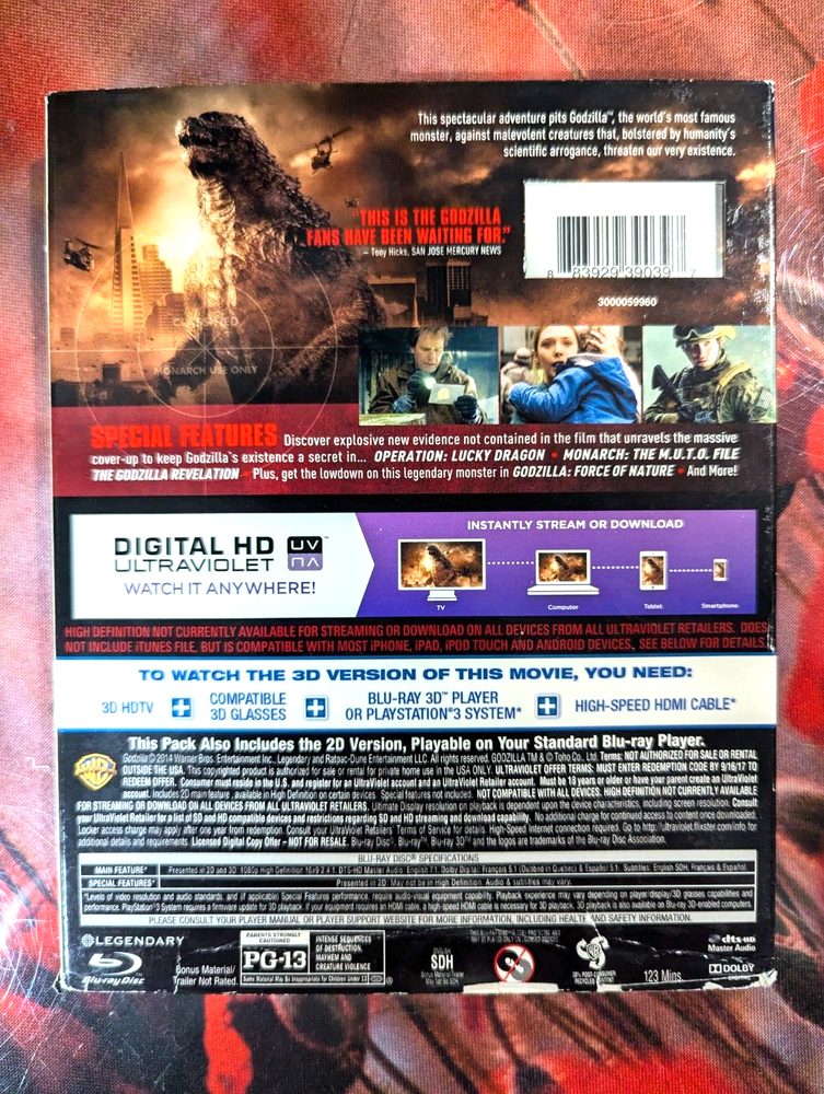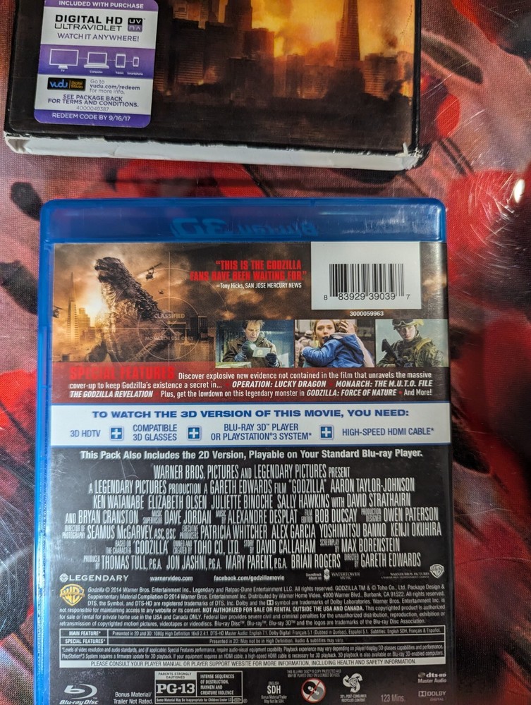 Item specifics Condition Like Newif ... Read more a Case Type Blu-ray Case Rating PG-13 Subtitle Language English, French, Spanish Director Gareth Edwards Sub-Genre Horror-Monsters Studio Warner Home Video Edition 3D Type Movie Format Blu-ray 3D Region Code Blu-ray: A (Americas, Southeast Asia...) Language English, French, Spanish Release Year 2014 Actor Ken Watanabe, Elizabeth Olsen Features Widescreen Genre Sci-Fi-Contemporary Movie/TV Title Godzilla UPC 0883929388448