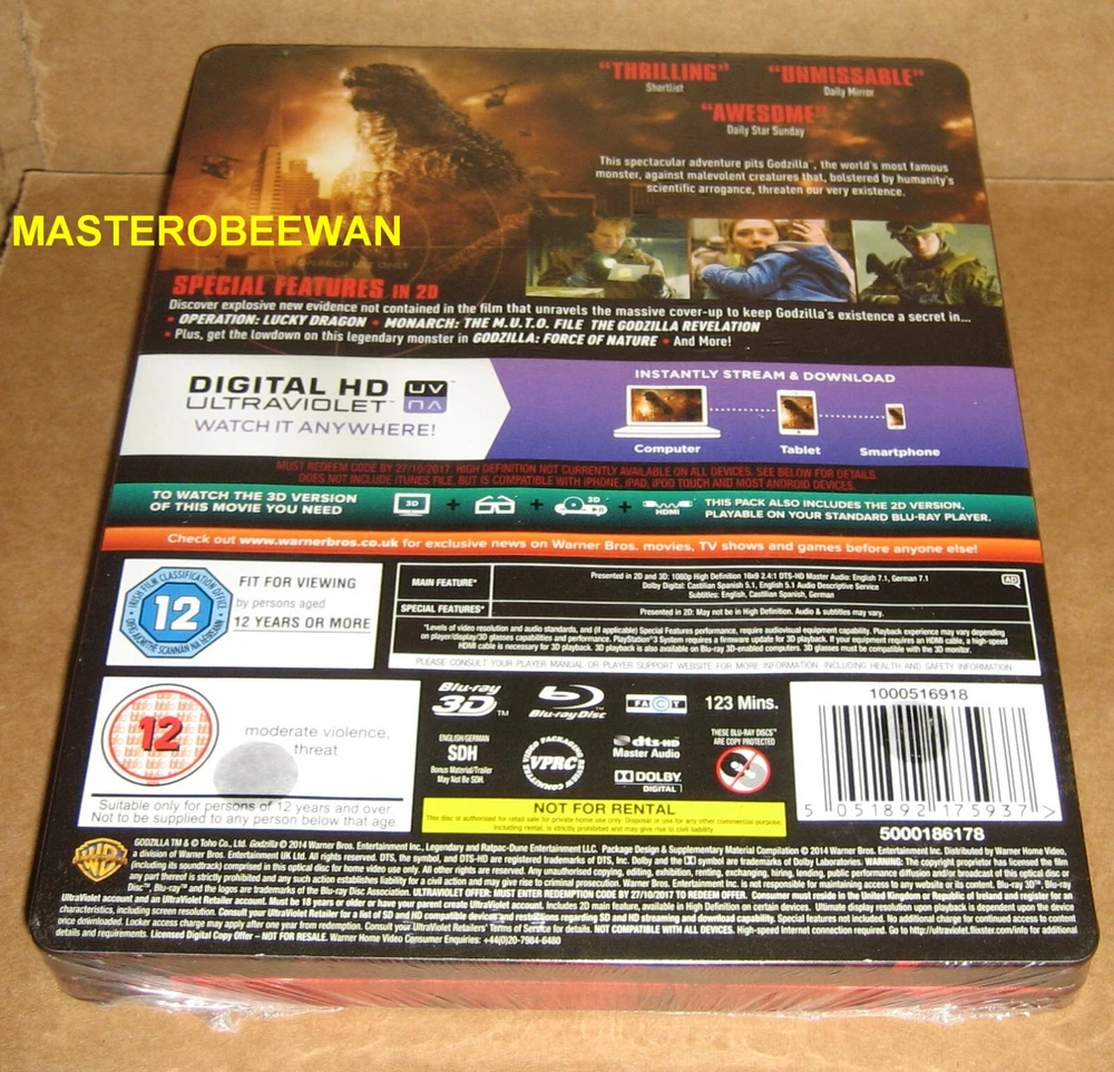 *** PLEASE READ THE TITLE AND DESCRIPTION VERY CAREFULLY BECAUSE I WON'T CANCEL ANY BIDS AT ALL FOR ANY REASON. IF YOU WIN THE AUCTION I WILL EXPECT YOUR FULL PAYMENT. ALSO BY PLACING A BID AND CHOOSING A SHIPPING OPTION, YOU ARE AGREEING TO MY TERMS*** THESE ARE ACTUAL PICTURES OF THE ITEM. THEY'RE NOT STOCK PHOTOS. IT'S THE ORIGINAL VERSION REGION FREE. FLORIDA RESIDENTS PAY 7% TAX. DO NOT WASTE A CHANCE TO OWN THIS AWESOME BLU-RAY BRAND NEW & FACTORY SEALED MOVIE (SEAM SEAL). THERE ARE NO TEARS, NO DENTS AND NO LOOSE DISCS. NOTE: IN ORDER TO SEE THIS MOVIE IN 3D VERSION, YOU NEED A BD 3D PLAYER, A 3D TV SET AND 3D GLASSES (THESE ITEMS ARE SOLD SEPARATELY AND NOT INCLUDED). FINAL SALE. SOLD AS IS. NO CANCELLATIONS. NO REFUNDS. NO RETURNS. 3D BLU-RAY + BLU-RAY GODZILLA 3D HMV EXCLUSIVE LIMITED EDITION STEELBOOK. UK REGION FREE. WILL BE SHIPPED WITHIN 1 DAY OF YOUR PAYMENT. TRACKING IS INCLUDED. SHIPPING OUTSIDE THE US: YOU'LL NEED TO PAY REGULAR USPS PRIORITY MAIL OR USPS EXPRESS MAIL. THEY BOTH OFFER TRACKING & INSURANCE. YOU MAY BE REQUIRED TO PAY IMPORT TAXES. THAT IS YOUR RESPONSIBILITY. I HAVE NO CONTROL OVER THOSE EXTRA FEES AND ARE NOT INCLUDED IN THE SHIPPING CHARGES. I will ONLY accept Paypal. NO EXCEPTION. YOU CAN CHECKOUT MY OTHER AUCTIONS FOR MORE GREAT DEALS AND RARE ITEMS.