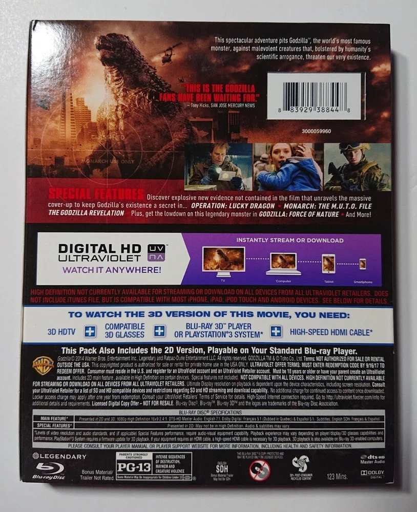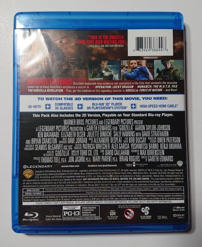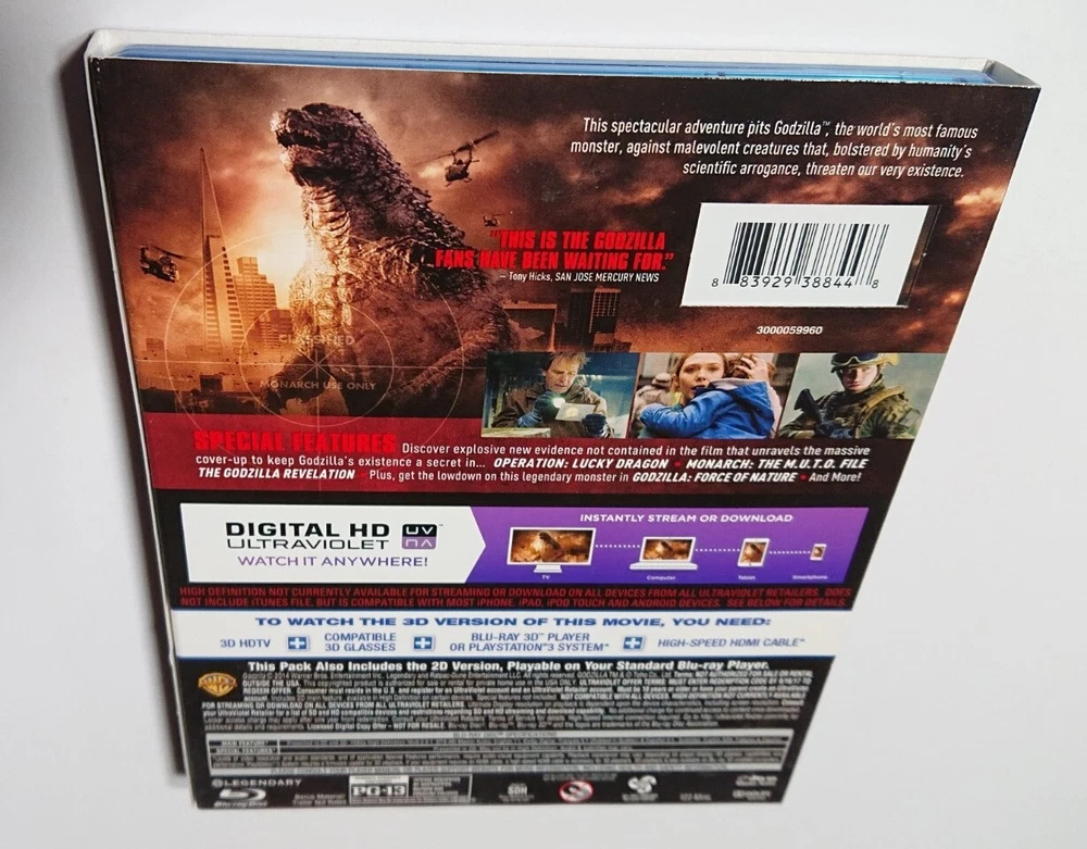 Godzilla 3D Two Mint Blu-ray Discs 2014 Lenticular Slipcase Edition & Mint DVD. Here is another classic from my personal collection, please be sure to check out my other listings for more. This set is mint entirely. All the discs are mint, as is the case and the slipcase. Codes are included but it's anyone's guess if they work, the dates may have expired. The case is fully functional with no cracks. The slipcase is in excellent condition, only ever so slightly worn. Please be sure to check out my other listings for collectibles and other unique items, and some additional movies, I will gladly combine shipping. Safely ships from a smoke and pet free home. I purchase professional shipping supplies to ensure the safe arrival of my items to you.