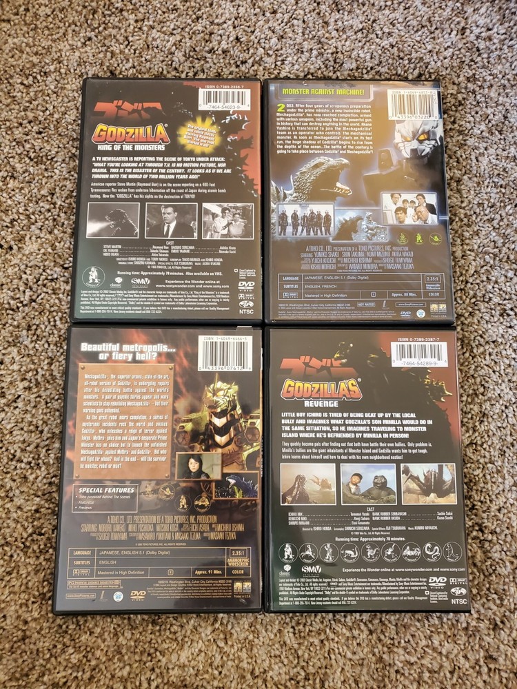 Godzilla 4 DVD Lot King Of The Monsters Revenge Tokyo SOS MechaGodzilla. Great preowned condition! All discs tested and fully playable. Shipping through USPS Media Mail....