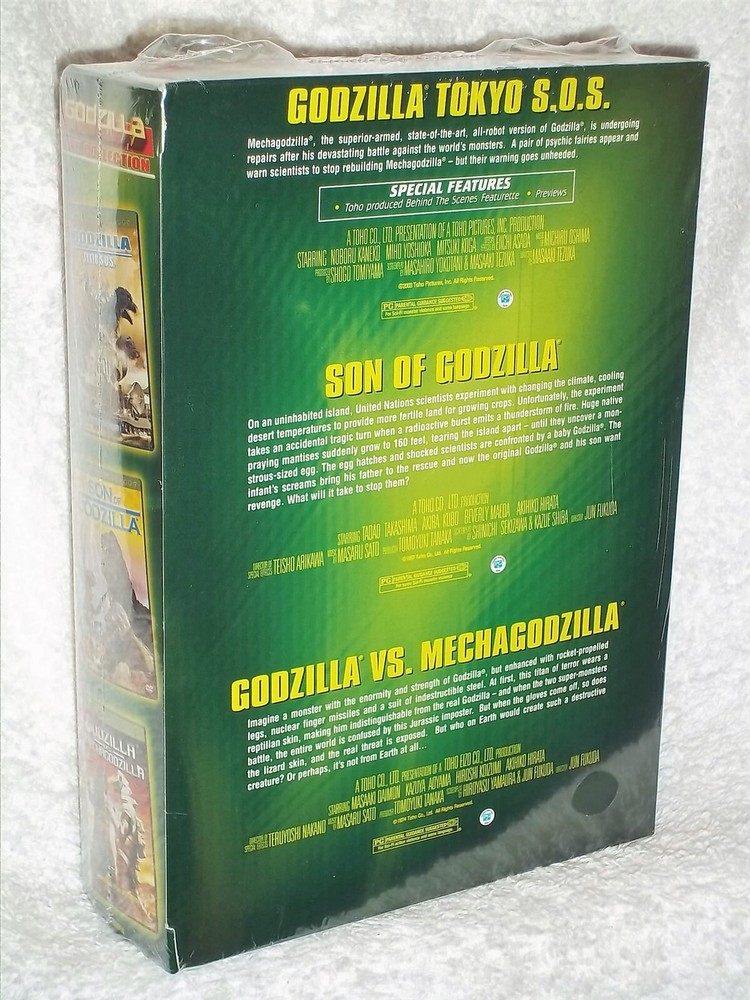 PLEASE READ BELOW BEFORE BIDDING AND ASKING ANY QUESTIONS ITEM DESCRIPTION This 3-Disc DVD is previously viewed but in EXCELLENT condition. The disc(s) are LIKE NEW. It includes all the original cases, covers, inserts and, of course, the disc(s) itself. DESCRIPTION GODZILLA®: TOKYO S.O.S. (2003): Noboru Kaneko, Miho Yoshioka, Mitsuki Koga; GODZILLA® VS. MECHAGODZILLA1974: Masaaki Daimon, Kazuya Aoyama, Akihiko Hirata; SON OF GODZILLA® 1967: Tadao Takashima, Akira Kubo, Bibari Maeda OUR TERMS AND GUARANTEES We will contact the auction winner(s) via email within 24 hours of auction close with any specific instructions that may be necessary to complete the transaction. We will also notify the auction winner(s) when their order has been shipped by sending an email to their ebay email address. WE DO NOT SELL illegal bootleg tapes, copies, screeners, or any type of illegally burned CDs/DVDs! ALL ITEMS ARE FACTORY ORIGINALS and, unless otherwise noted, include their ORIGINAL US factory made cases, inserts/game book and, of course, the items themselves. All DVDs are GUARANTEED. If you receive a damaged, defective or otherwise unusable item from us, please inform us within 15 days of shipment and we will replace the defective product. In the event that the defective item is no longer available, we will substitute for another item, credit your account or issue a refund minus the Shipping. Buyer must make contact within 3 days of the end of auction and payment must be made within 10 days of the end of auction. Please have funds ready to send when you are bidding. Your personal information will never be shared or sold to anyone. Your transaction is strictly confidential, and you will receive your product in discreet packaging . Finally, there should NEVER be a reason to leave us negative feedback. That is NOT the proper way to get our help with a problem, just contact us and give us a chance to provide an appropriate solution. Permanently hurting our reputation by leaving us negative feedback or threatening negative feedback will NOT get you the service you are looking for, again, just email us if you have a problem with your purchase. PAYMENT TERMS Payment is expected within 10 days after the auction closes. Please include the following with your payment: Username Auction number(s) Item name Shipping Address We accept the following forms of payment: . PAYPAL Credit Cards (Contact us for details) SHIPPING TERMS Your DVD(s) will be shipped within 48 hours of receipt of payment. All DVDs will be shipped discreetly . The flat rate shipping fee using USPS FIRST CLASS MAIL is $ 3.00 for the 1st DVD, $2.00 for each additional within the USA . International orders, INCLUDING CANADA, using USPS AIRMAIL are $20.00 for the first DVD, $5 for each additional. Rush and Expedited shipping options are available to most areas; please feel free to contact us for pricing and other details regarding the auction. I COMBINE SHIPPING Please View Our Other Auctions And Save On Shipping Powered by SixBit's eCommerce Solution