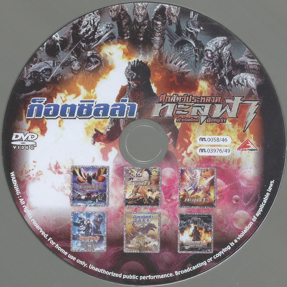 Up for sale today is a DVD oddity! A Thai 6-in-1 DVD consisting of "Mothra" (1996); "Mothra 2" (1997); "Mothra 3" (1998); "Godzilla Against Mechagodzilla" (2002); "Godzilla: Tokyo S.O.S. (2003); and "Godzilla: Final Wars" (2004). These are the VCD encodes of the film placed onto a DVD. These films are presented DUBBED IN THAI. There is no English audio or subtitles on this disc. "Mothra" has a run time of 70 minutes. "Mothra 2" has a run time of 74 minutes. "Mothra 3" has a run time of 70 minutes. "Godzilla Against Mechagodzilla" has a run time of 89 minutes. "Godzilla: Tokyo SOS" has a run time of 91 minutes. "Godzilla: Final Wars" has a run time of 125 minutes.