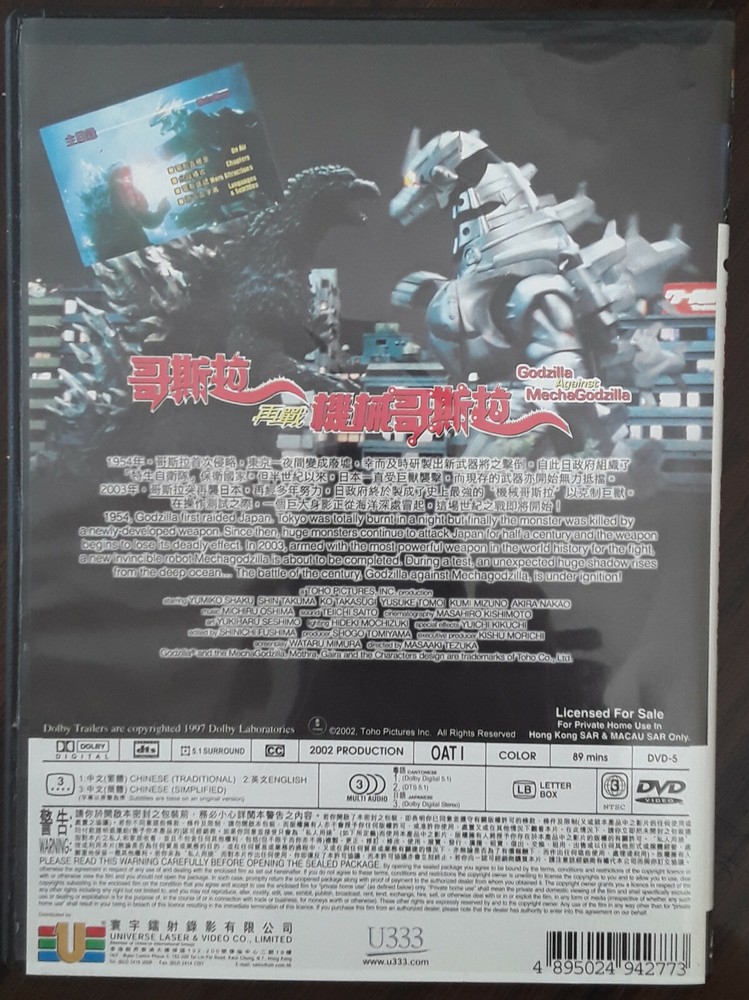 Godzilla Against MechaGodzilla DVD, Japanese with English Subtitles and Chinese Traditional and Chinese simplified subtitles, Region 3, 89 minutes run time....