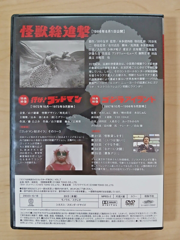 Notes: Region 2. Japanese language. Disc and case only - no extras/inserts/appendices. Contents: *Original 1968 Japanese theatrical version of Destroy All Monsters Disc and case are in great shape, though case is not sealed so considered used. Please review the pictures above and judge for yourself. Note that this is a Region 2 disc, so please confirm your player can run this disc. All items will be shipped Ground Advantage or Priority Mail with cardboard protection. ------------------------------------------------------------------------------------------------------------------------ I'll happily combine shipping (though please contact me first for international orders) and generally make trips to the post office every weekday, barring extreme weather or holidays. I also pack everything as best as I reasonably can, using cardboard supports and plenty of bubble wrap. Particularly rare, fragile, or expensive items will be shipped in boxes. Thank you for your interest! ~CK Indies and Imports
