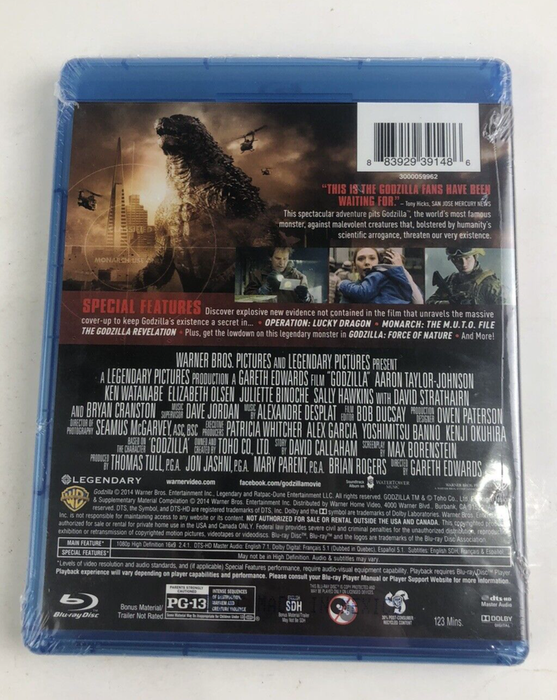 Green with Env y Visit the eBay Shop Godzilla Blu-Ray, 2014, Bryan Cranston, Gareth Edwards (The Creator), Extras Godzilla Blu-Ray, 2014, Bryan Cranston, Gareth Edwards (The Creator), Extras. Seal on blu ray is good. No tears in the seal. BIDDING: Please ask questions and read the terms below BEFORE you place a BID. If there are any questions about an item, I do my best to give you even more information about an item. Your bid is a contract to purchase the item! ******Kentucky bidders will be charged 6% sales tax. PAYMENT: Buy It Now Option – immediate payment required. SHIPPING: Shipping rates are based on the shipping costs to the destination. You will be notified if an additional packaging fee is necessary, especially for heavier or larger items (such as furniture) that require special boxing. I will try my best to ship within 3 business days of payment. Sometimes it might take me longer depending on the item and the packing involved. If for some reason, an item arrives broken, the buyer must notify me via email and be able to provide a photo of the damage (for insurance purposes). I try to pack every item very carefully, making sure it gets to its new home in great condition! REFUNDS: ALL SALE ARE FINAL. I do my best to describe and provide detailed pictures of my items so that you are happy with your purchase. I try to list ALL information about an item listed for auction whether it is good or bad. However, it is often not possible to mention every imperfection that occurred during an item’s manufacturing or use. Minute scratches, normal wear, color variances, straw marks, bubbles, swirls, or smudges are inherent to antique glassware and collectibles as well as vintage furniture pieces. I like everyone to have a POSITIVE ebay experience. If an item is grossly misrepresented, I will make every effort to accommodate the situation.