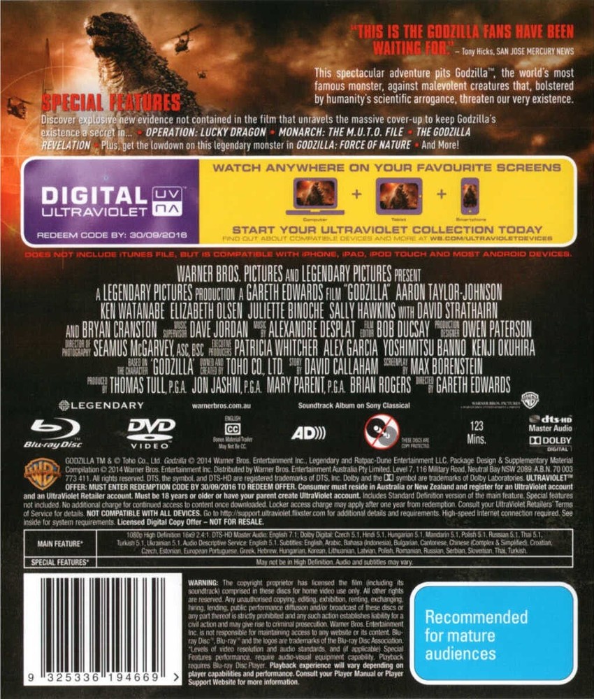 Brand new and sealed, this Blu-Ray edition of "Godzilla" is a must-have for fans of action and adventure movies. Directed by Gareth Edwards and starring an ensemble cast including Bryan Cranston and Elizabeth Olsen, this film promises 135 minutes of thrilling entertainment. With a PAL video format and 2.35:1 aspect ratio, immerse yourself in the epic battle of the iconic monster. Get ready to experience the ultimate showdown with this Region B release from Warner Bros.